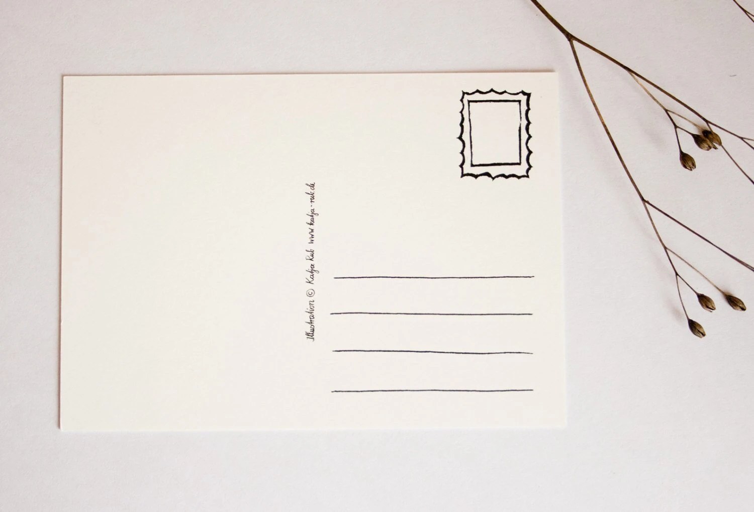 Ein königlicher Wal schwimmt auf ein Riff zu. Strahlende Postkarte mit einer Illustration von Katja Rub.