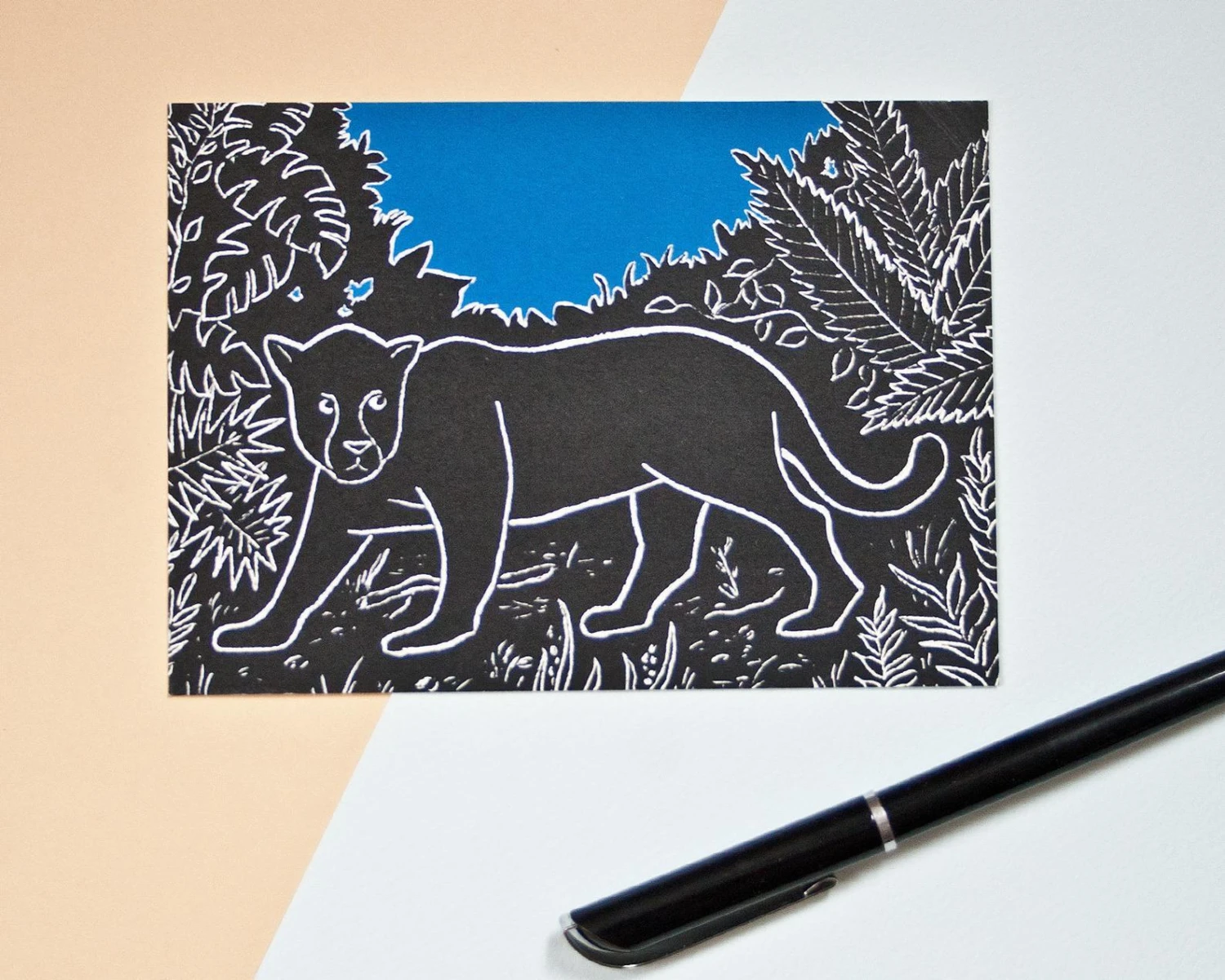 Die Künstlerin Katja Rub hat diesen Jaguar auf Schabekarton gestaltet und ihn dann in einer lokalen Druckerei vervielfältigen lassen.