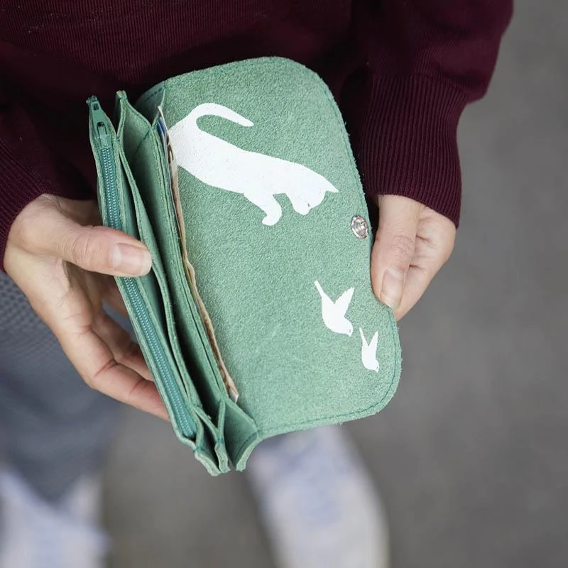 Eine dunkelblaue Geldbörse aus Leder, die im ihren Inneren eine jagende Katze mit Vögeln offenbart.