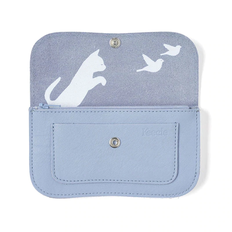 Eine helllila Geldbörse aus Leder, die im ihren Inneren eine jagende Katze mit Vögeln offenbart.