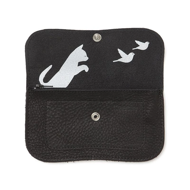 Eine schwarze Geldbörse aus Leder, die im ihren Inneren eine jagende Katze mit Vögeln offenbart.