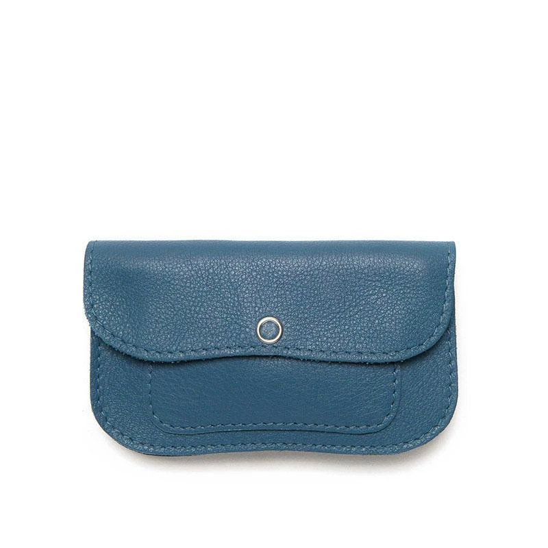 Eine blaue Geldbörse aus Leder, die im ihren Inneren eine jagende Katze mit Vögeln offenbart.