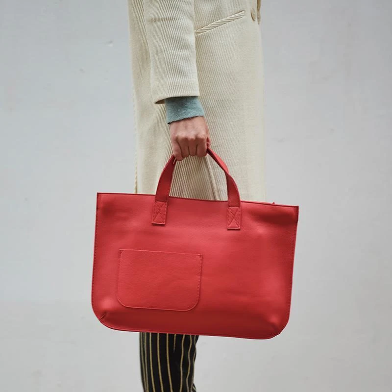 Eine geräumige Ledertasche mit kurzen Henkeln. Ein MacBook pro mit 13 Zoll kommt darin unter. Oder einen Ipad und eine Mappe mit Papieren.