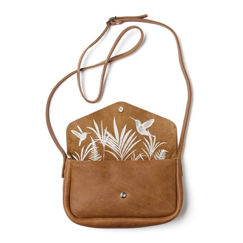 Die Innenseite zeigt einen weißen Siebdruck mit Kolibris und Grünzeug und verfügt über ein extra Fach, z.B. für Dein Telefon.