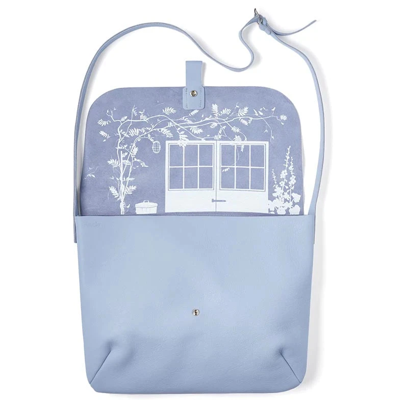 Eine Schultertasche mit ausreichend Stauraum für alles, was man braucht. Sogar ein Laptop findet hier Platz. Das ebenso stilvolle wie praktische Modell Back Yard ist ein perfekter Begleiter für Büro und Freizeit. Auf der Innenseite überrascht die Taschenklappe mit einem tollen Motiv in Siebdrucktechnik: Blauregen und Stockrosen schmücken den Eingang zu einem Gartenhaus, in dem sich jeder wohlfühlen würde.