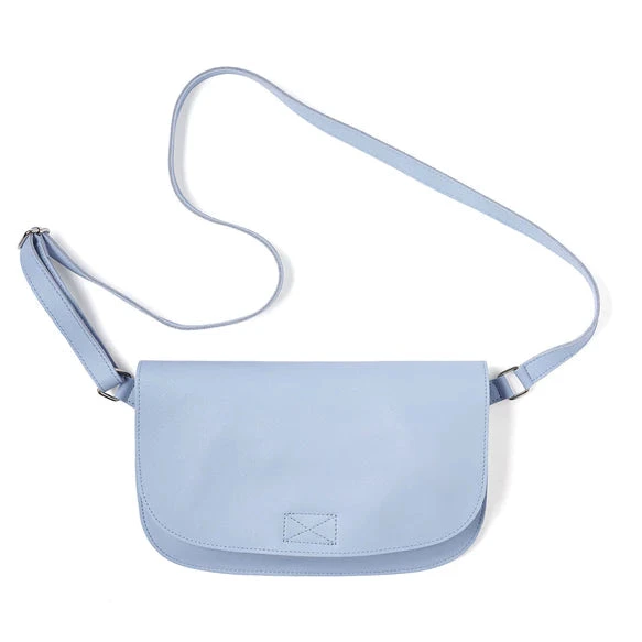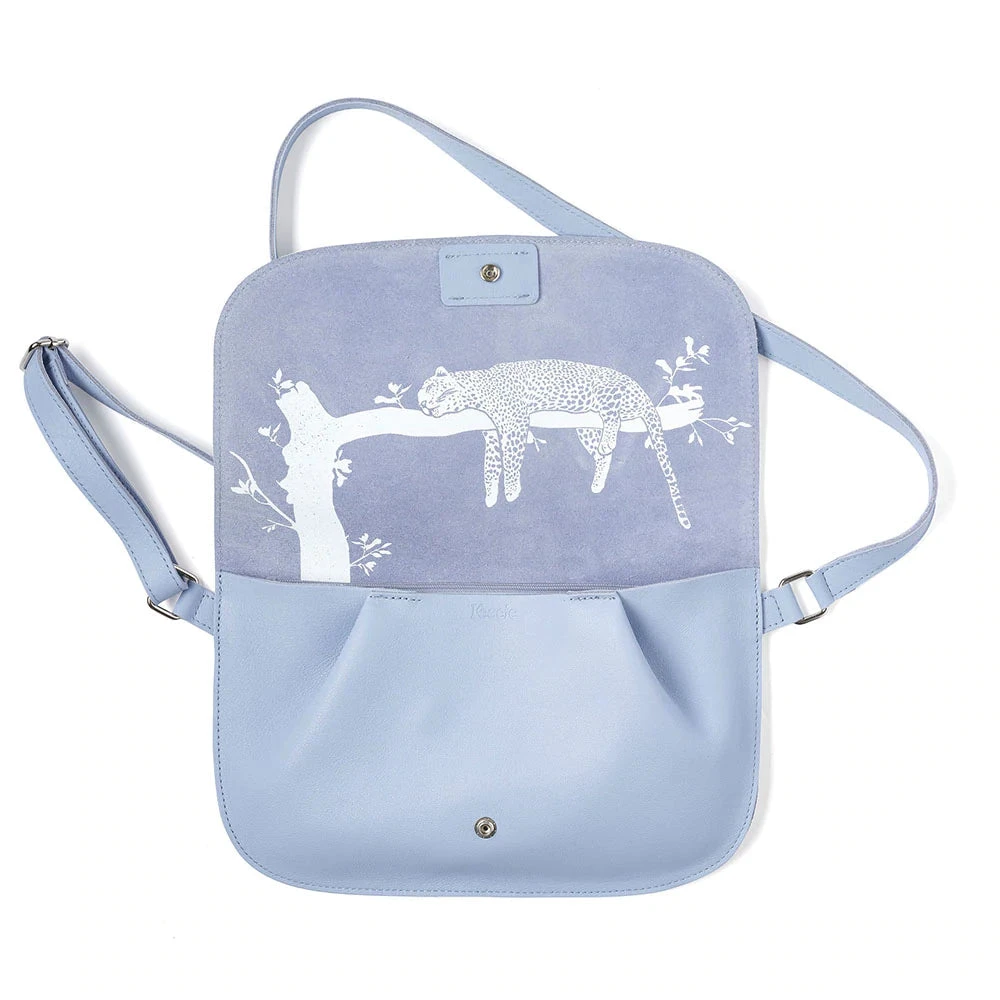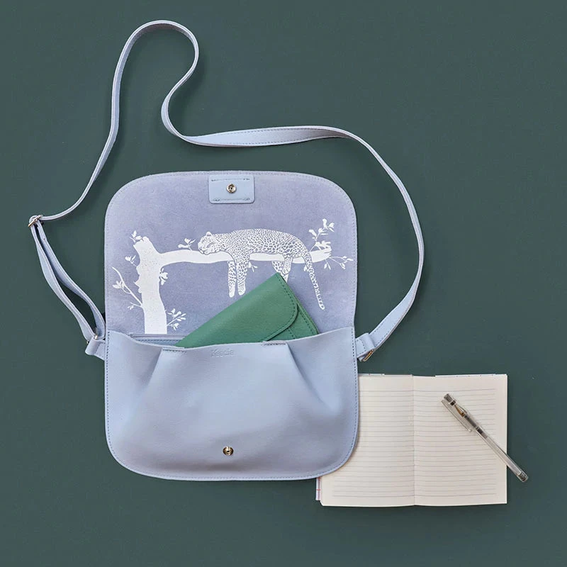 Die minimalistische zart lilafarbene Ledertasche mit verstellbarem Riemen lässt sich auf verschiedene Arten tragen: ob als Schultertasche oder Cross Body Bag, sie macht immer eine gute Figur. In ihrem Inneren überrascht sie mit dem faulen Leoparden, der es sich auf einem Ast gemütlich gemacht hat.