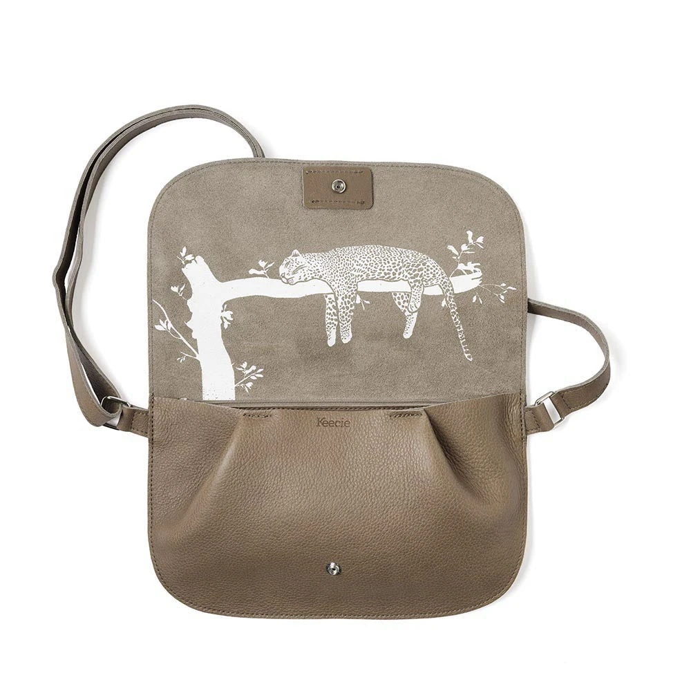 Die minimalistische Ledertasche in Leder mit verstellbarem Riemen lässt sich auf verschiedene Arten tragen: ob als Schultertasche oder Cross Body Bag, sie macht immer eine gute Figur. In ihrem Inneren überrascht sie mit dem faulen Leoparden, der es sich auf einem Ast gemütlich gemacht hat.