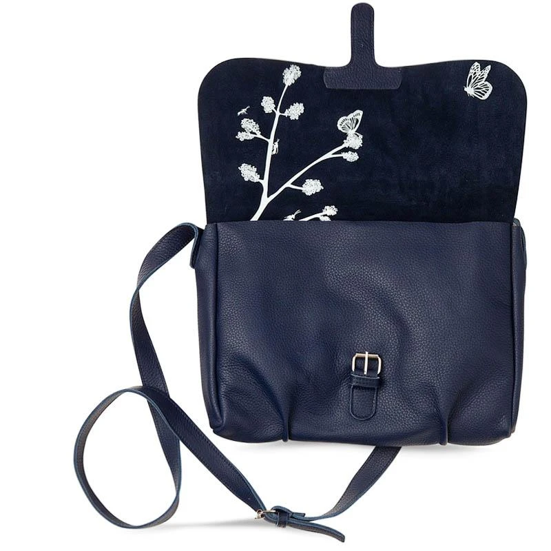 Auf der Innenseite überrascht die Ledertasche mit Blüten und Schmetterlingen.
