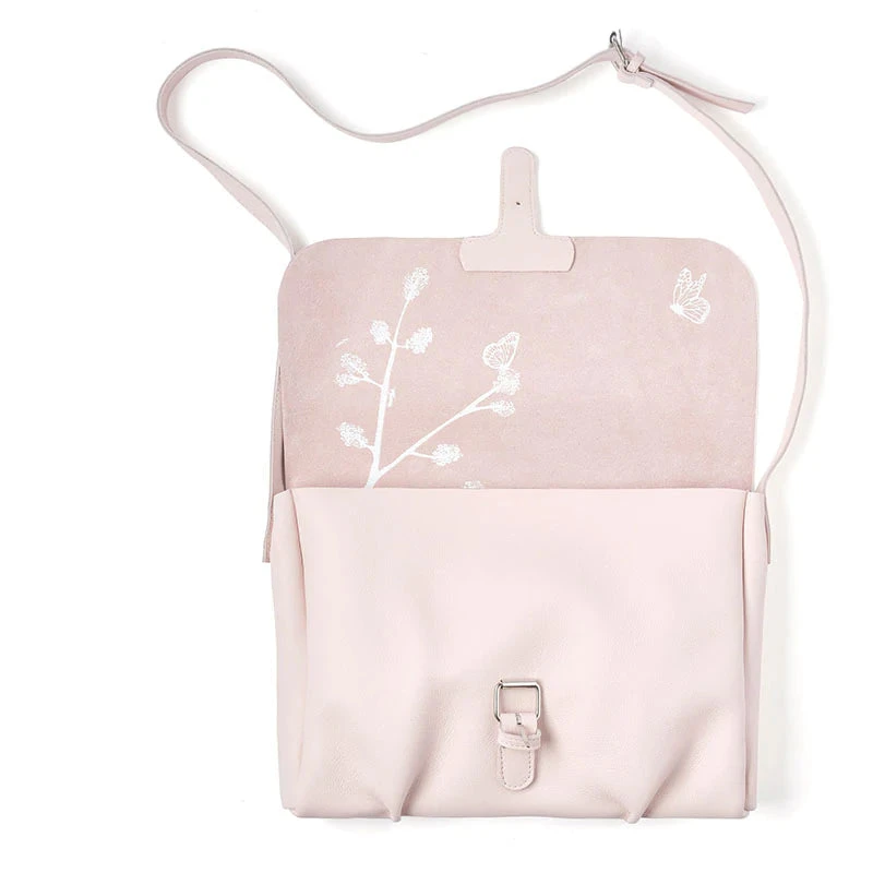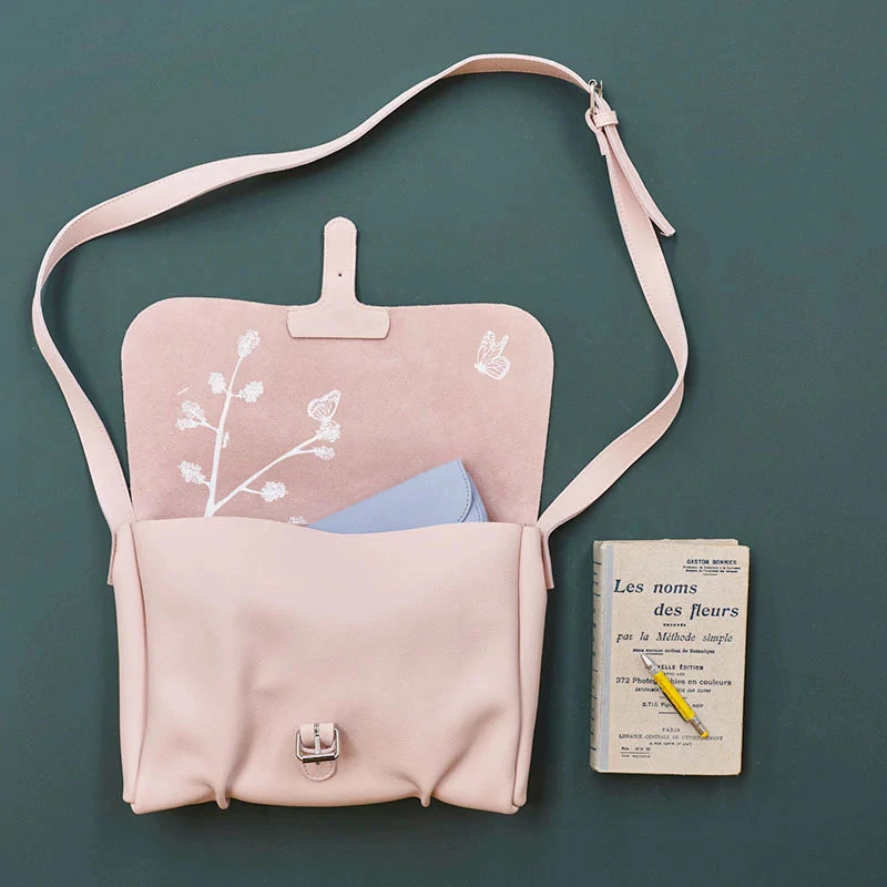 Auf der Innenseite überrascht die Ledertasche mit Blüten und Schmetterlingen.