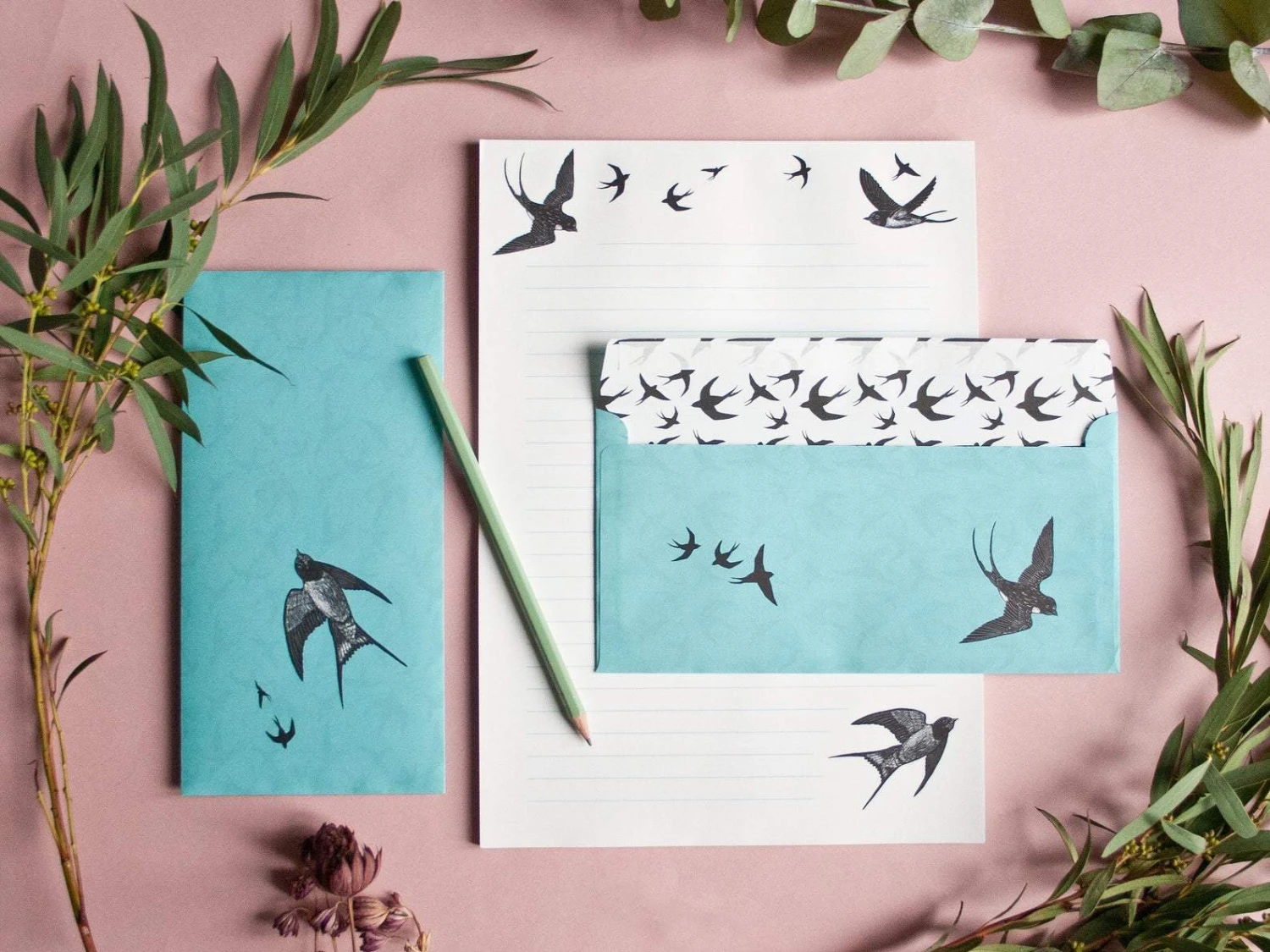 Ein hübsches Briefpapier Set bestehend aus einem Briefblock und passenden Umschlägen. Ein Schwarm Schwalben ziert Briefpapier, Umschlag und auch die Innenseite der Umschläge.