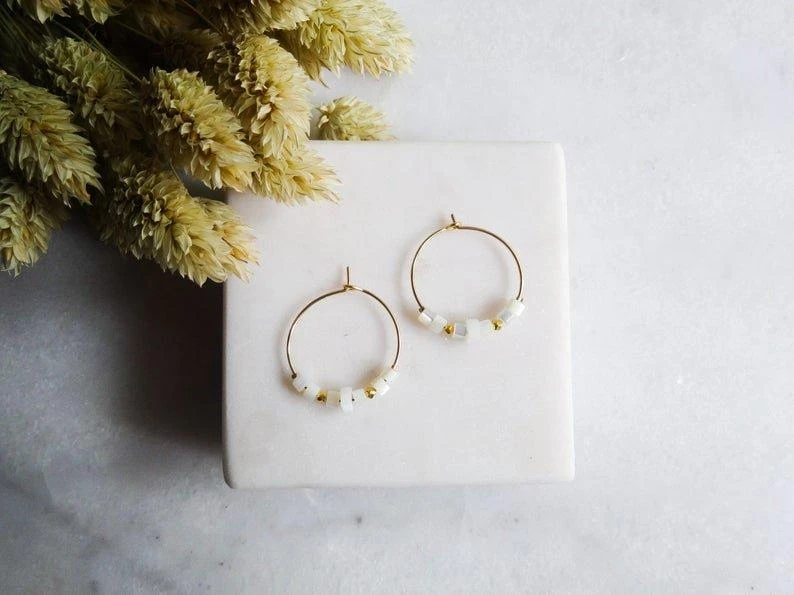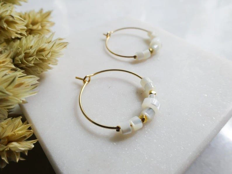 Die Creolen Nova sind mit Perlmutt Perlen und kleinen goldfarbenen Perlen bestückt.