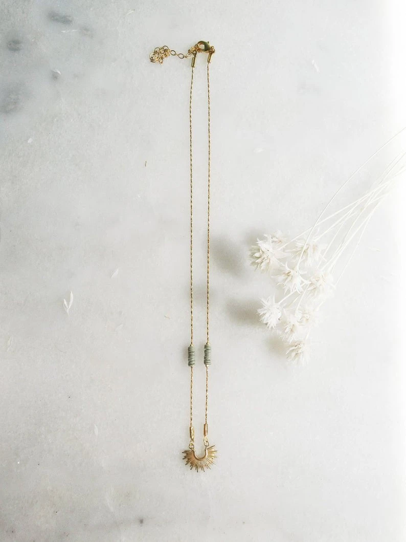 Halskette mit filigranem Strahlenkranz kombiniert mit khaki farbenen Heishi Perlen.
