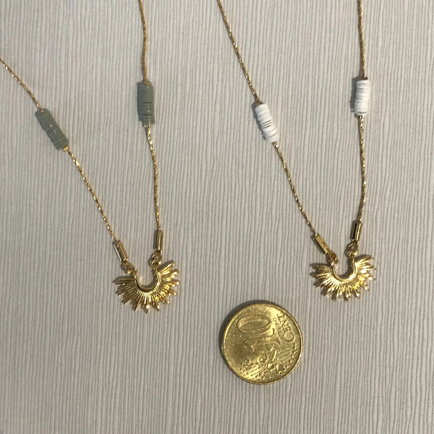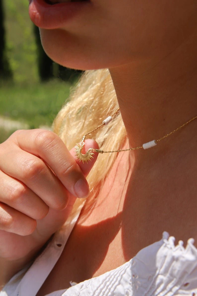 Halskette mit filigranem Strahlenkranz kombiniert mit weißen Heishi Perlen.