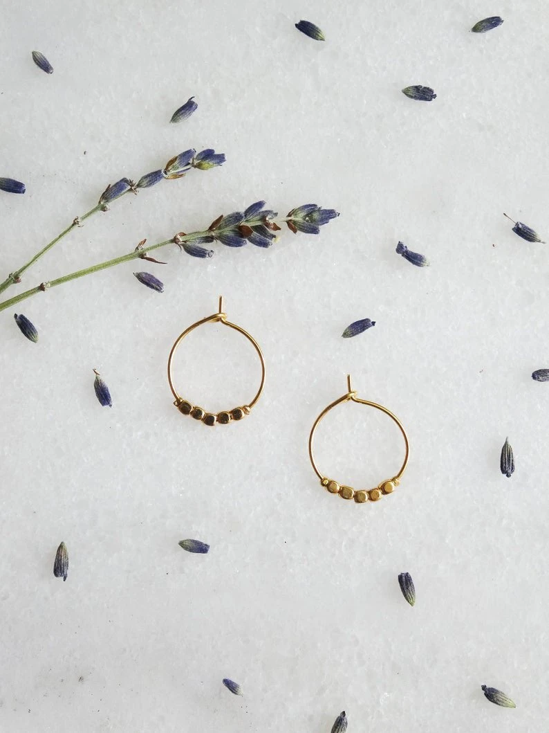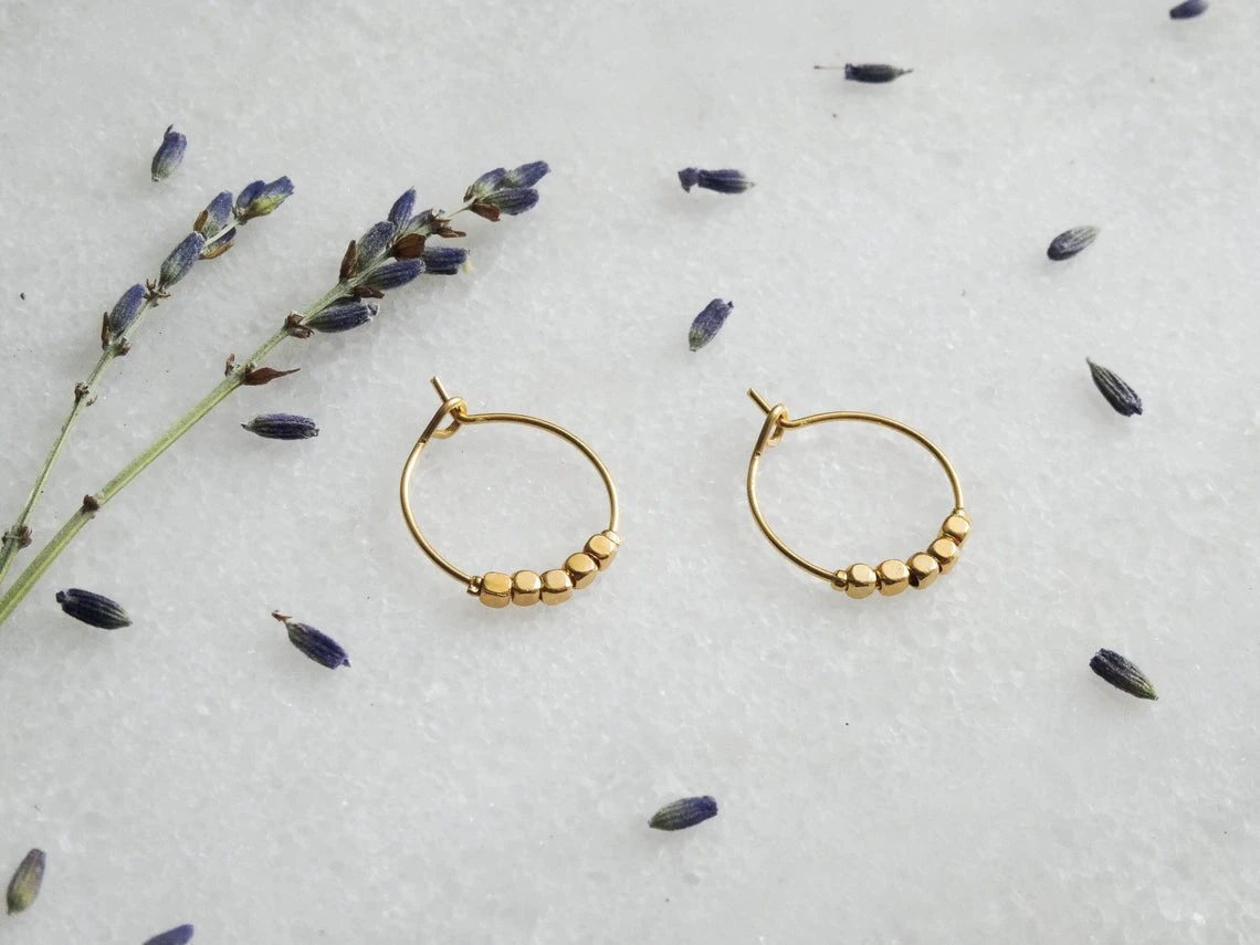 Schlichte, filigrane Creolen mit kleinen eckigen Perlen.