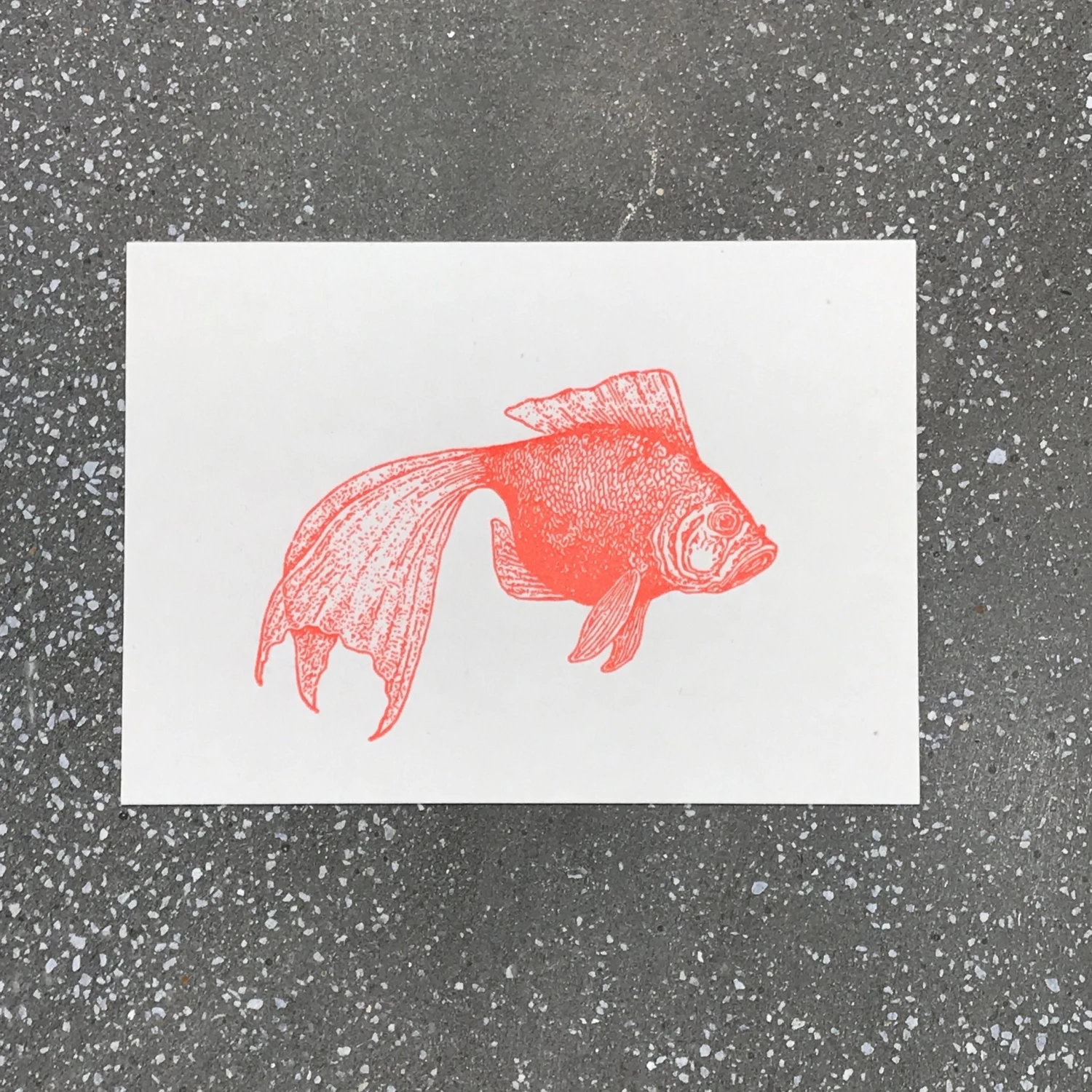 Ein neonfarbener Fisch mit großen Schwanzflossen schwimmt auf dieser Postkarte.