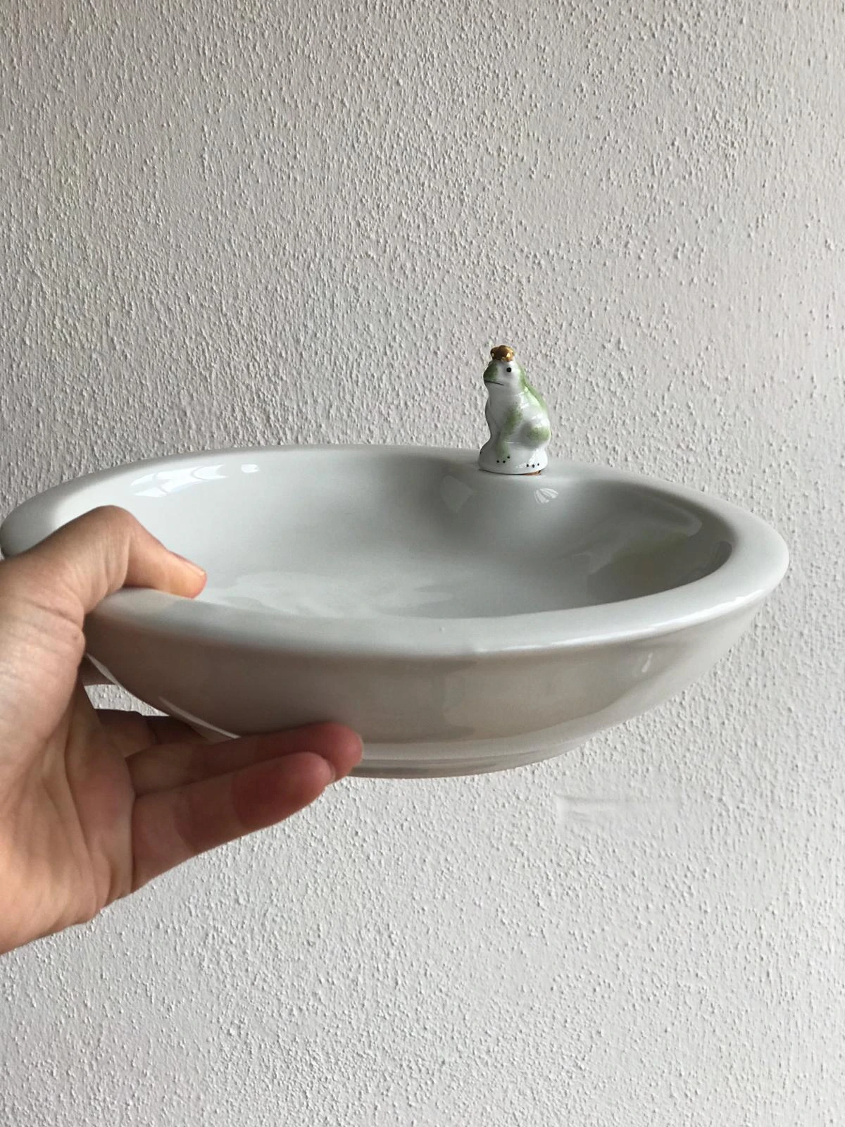 Kennt ihr noch die Warmhalteteller, die schon bei unseren Urgroßeltern auf dem Tisch standen? Hier sitzt ein Froschkönig am schlichten Tellerrand.