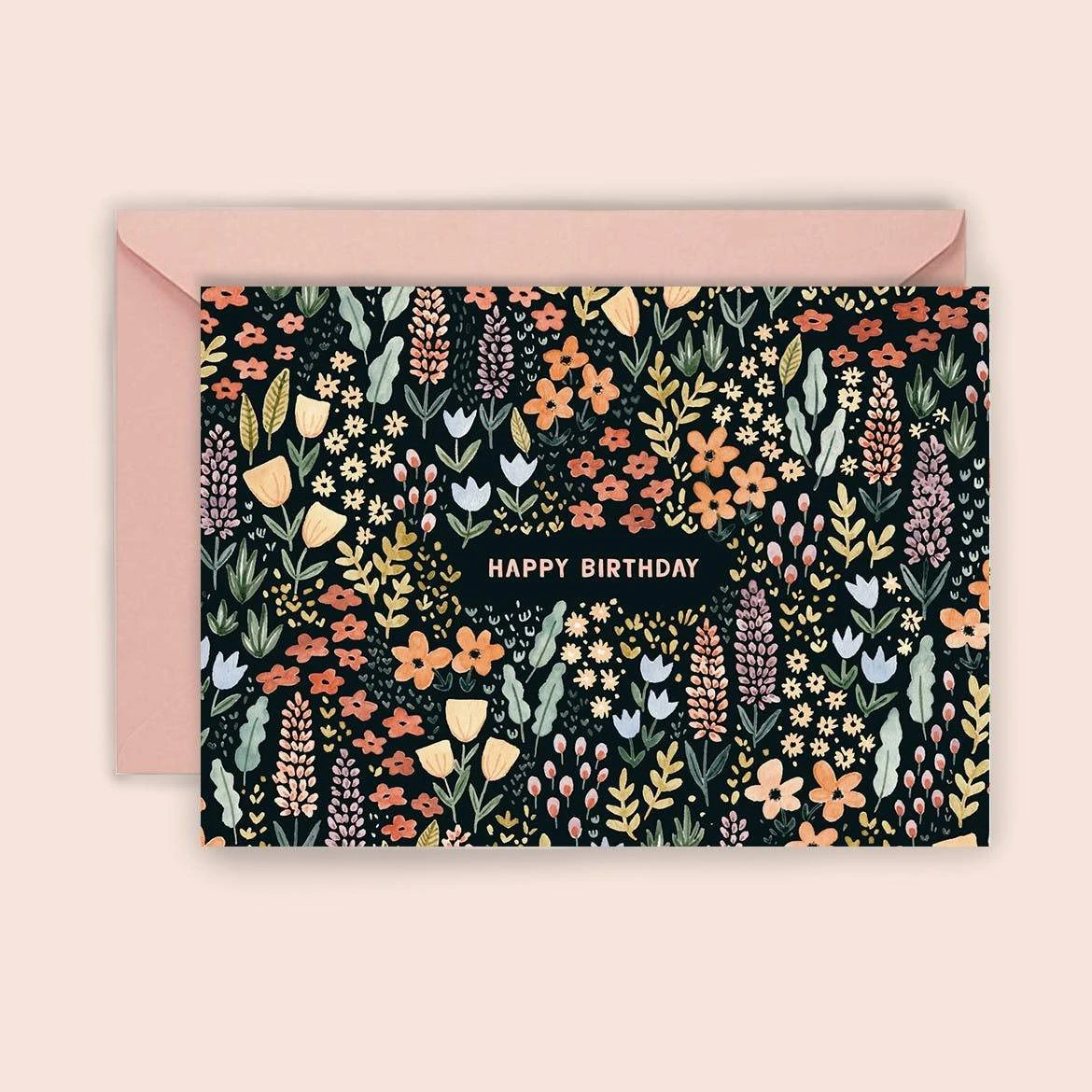 Eine bunte Blumenwiese auf schwarzem Grund zeigt diese Grußkarte zum Geburtstag.