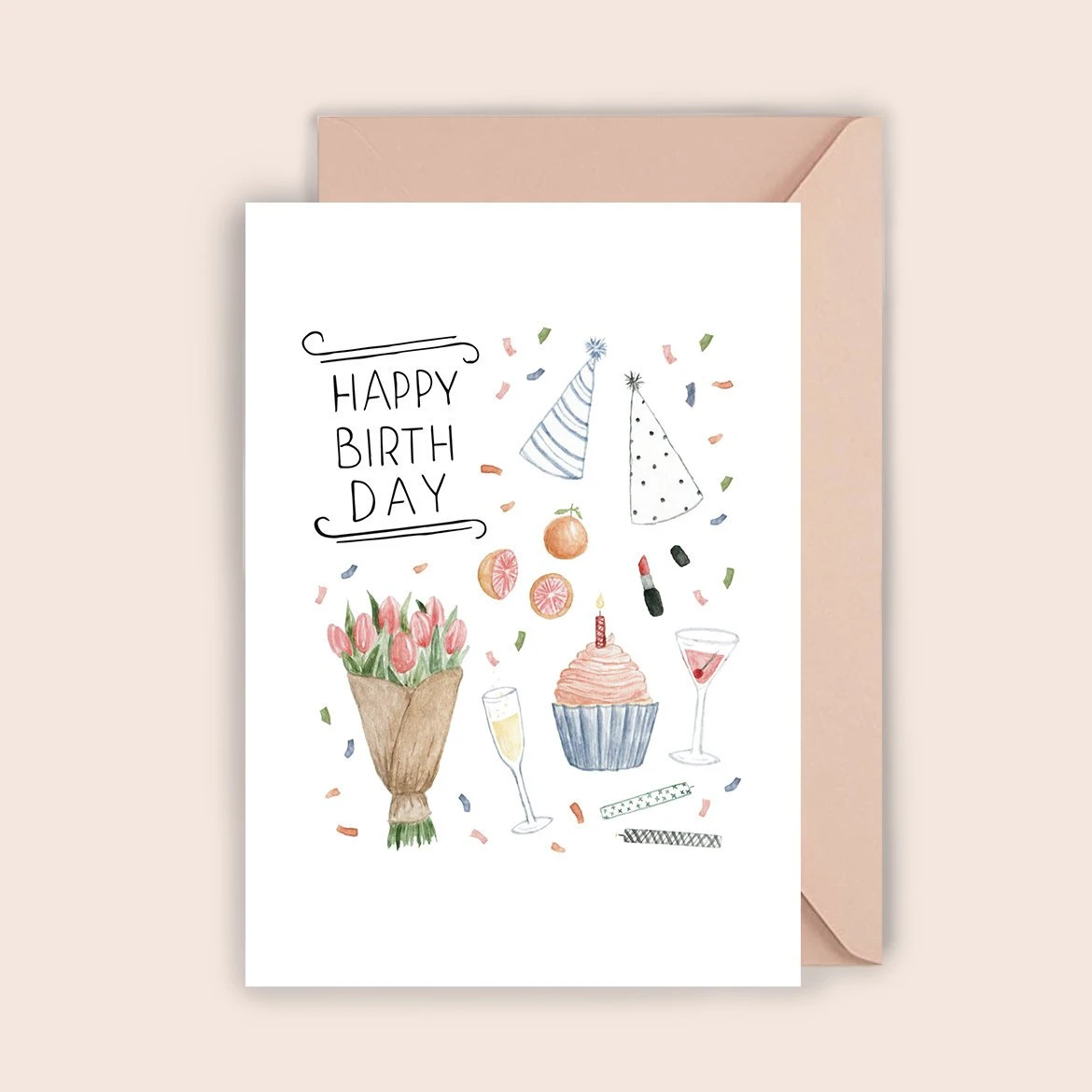 Happy Birthday!, sagt diese Geburtstagskarte mit dem Tulpen, Martini, Sekt und Cupcakes.