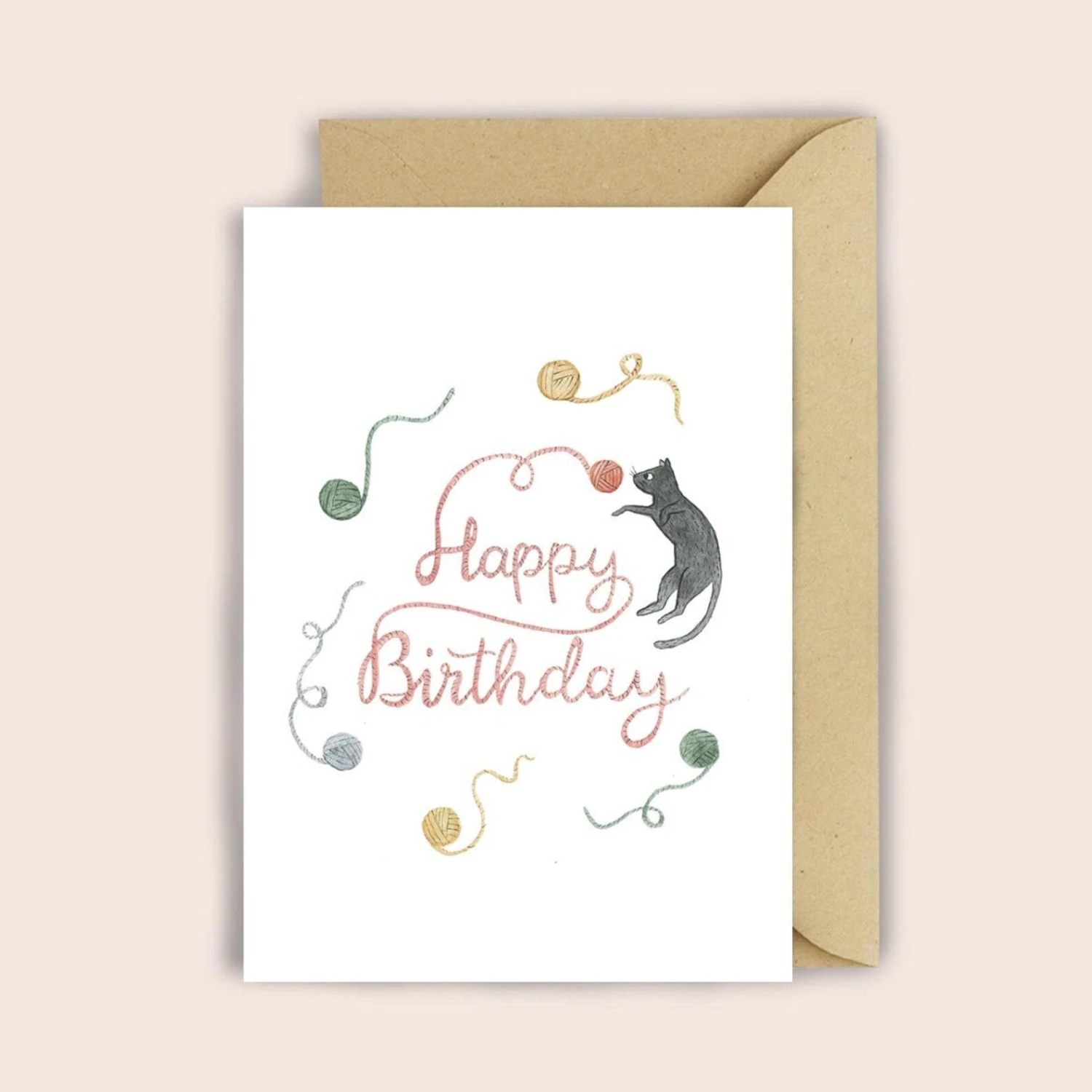 Grußkarte zum Geburtstag mit einer schwarzen Katze die mit Garn spielt.