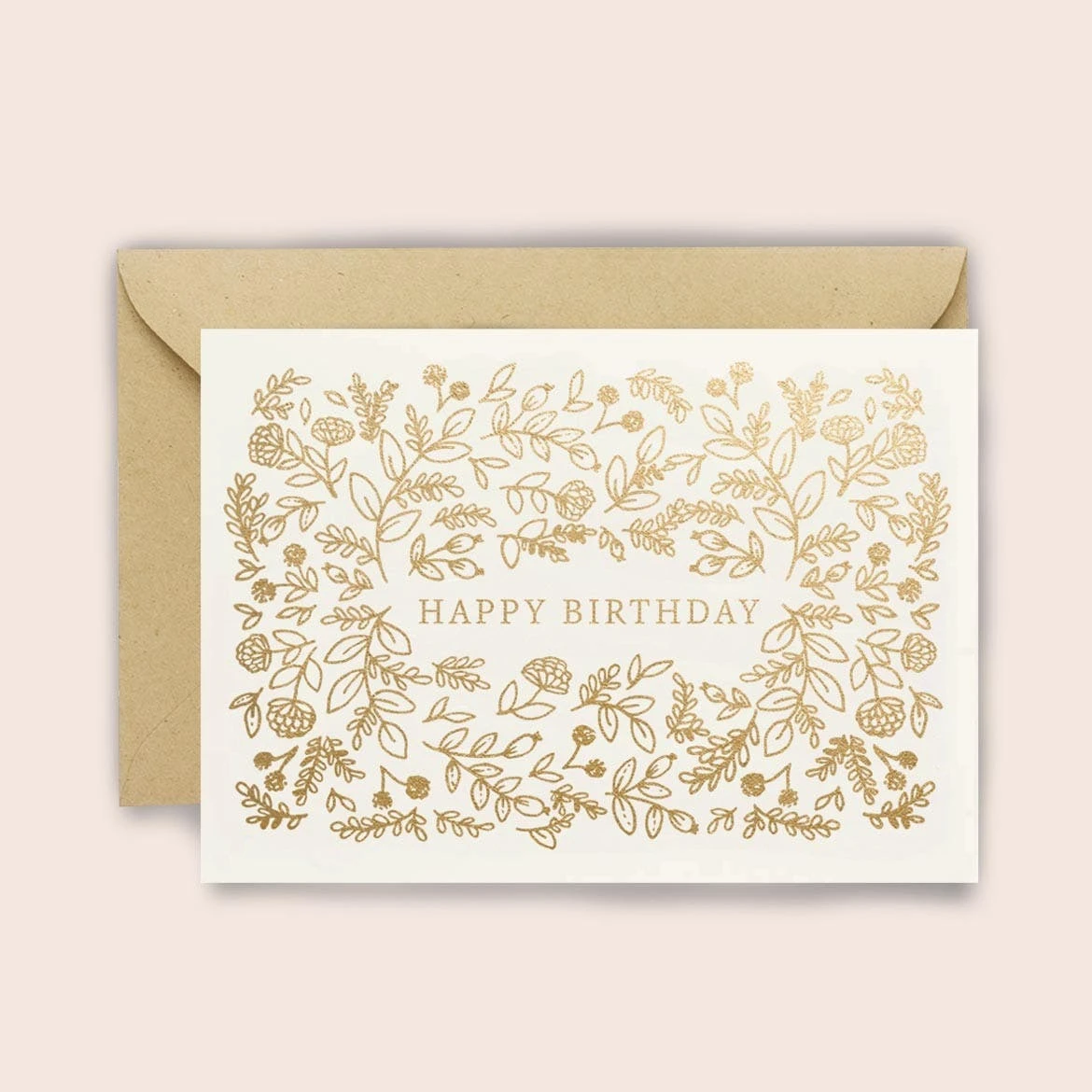 Happy Birthday umrandet von filigraner Blumenzeichnung in Goldprägung.