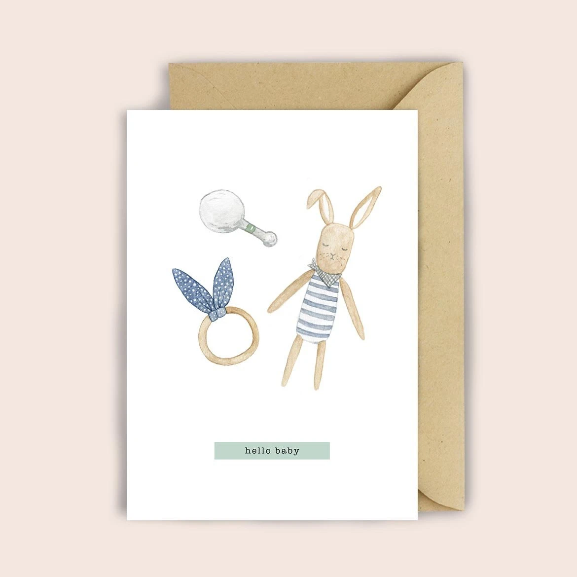 Karte zur Geburt mit der Illustration eines Kuschelhasen, Babyrassel und Greifring in blau.