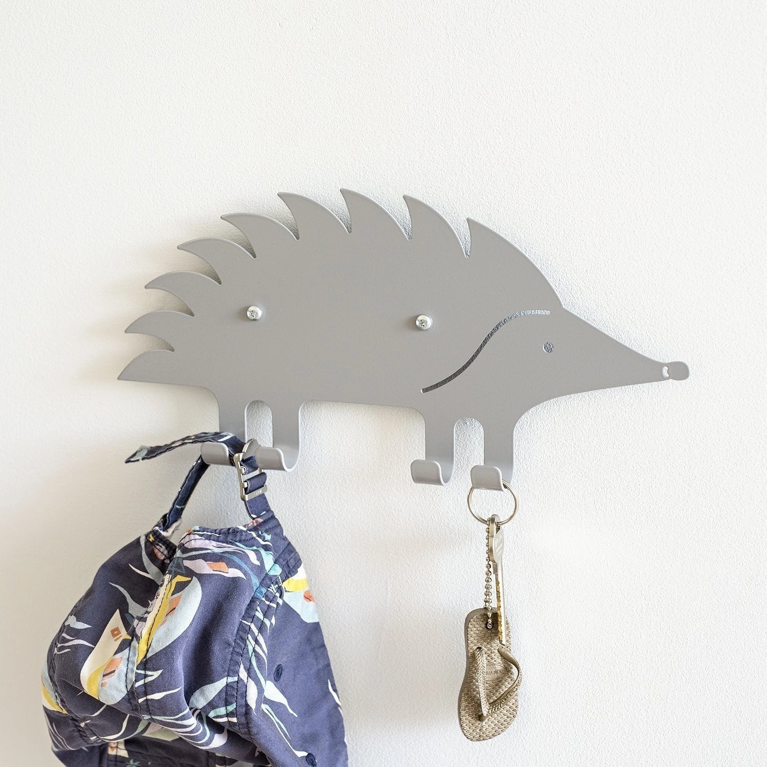 Ein Kleiderhaken, der gute Laune macht! Der graue Igel eignet sich als Garderobenhaken für Kinder.