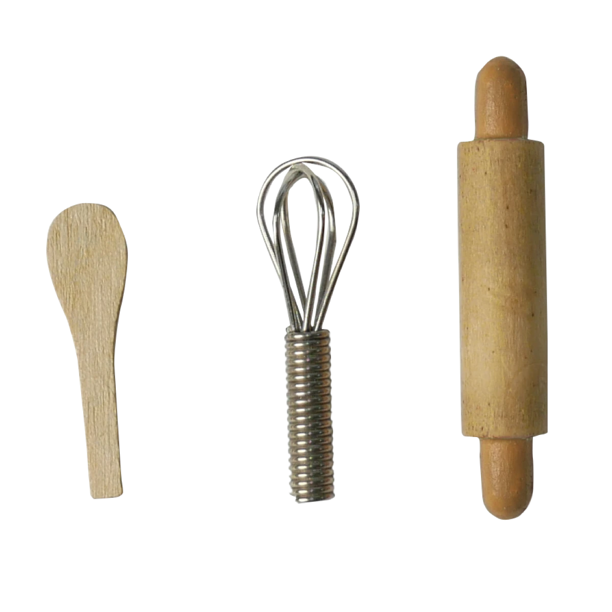 Auch Puppen und Mäuse mögen Kuchen und Pizza. Um die zu Backen brauchen sie natürlich ein Nudelholz, einen Spatel und einen Schneebesen!