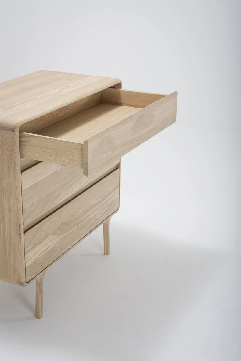 Die Kommode FAWN besticht durch ihre abgerundeten Ecken, ihre glatten Flächen und ihre filigranen Beine. Massives Eichenholz in außergewöhnlicher Handwerkskunst bearbeitet. Ein Möbelstück an dem Du lange Freude haben wirst.