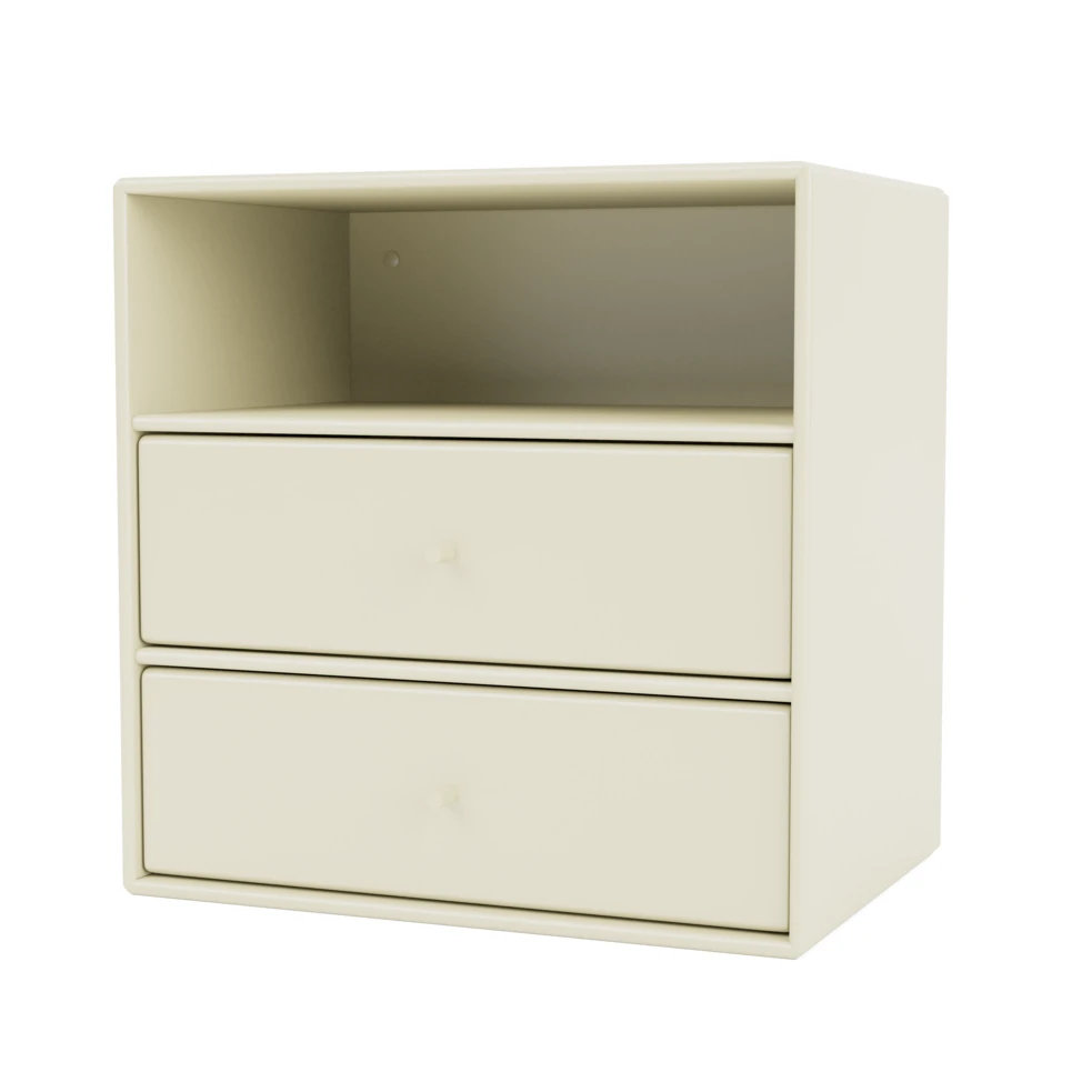 Das kleine Regalmodul beinhaltet drei Fächer und zwei Schubladen. Die Schubladen passen in alle drei Fächer und können beliebig angeordnet werden.