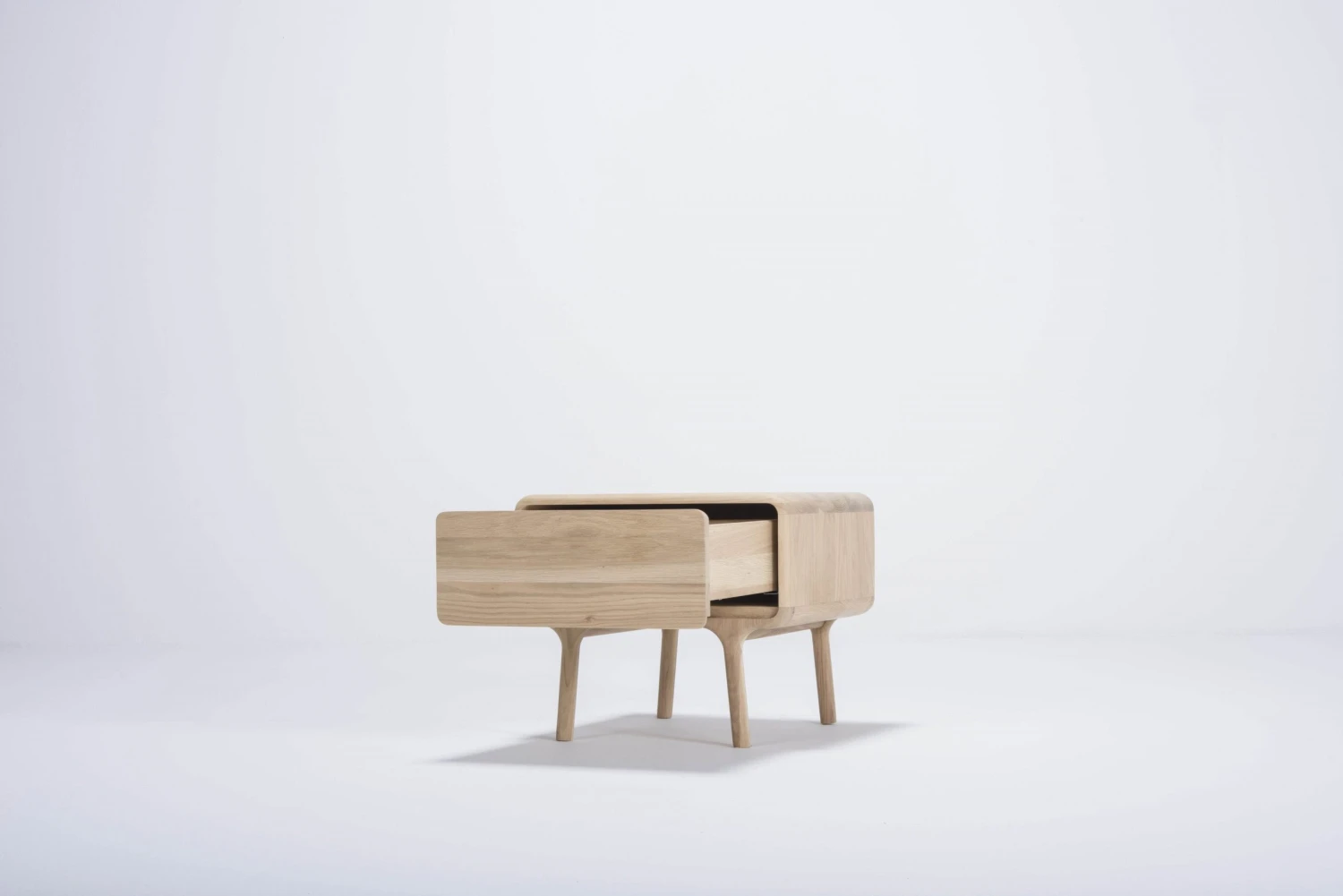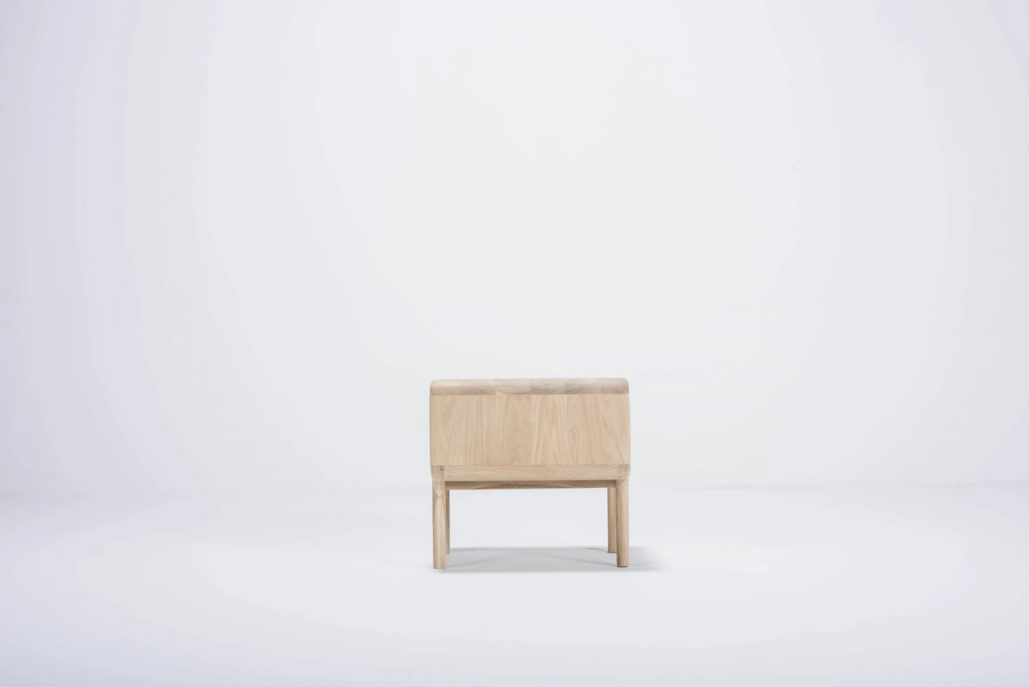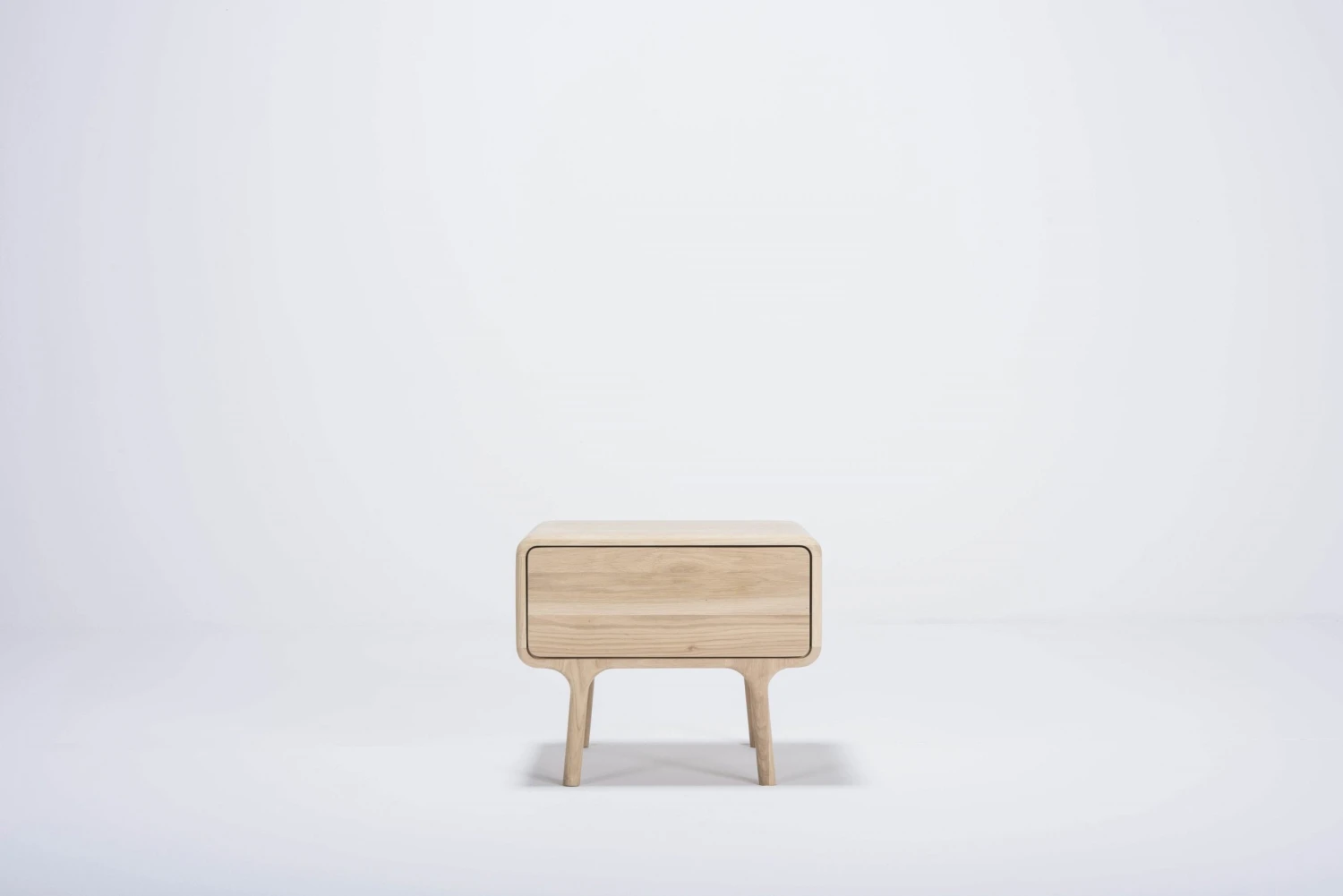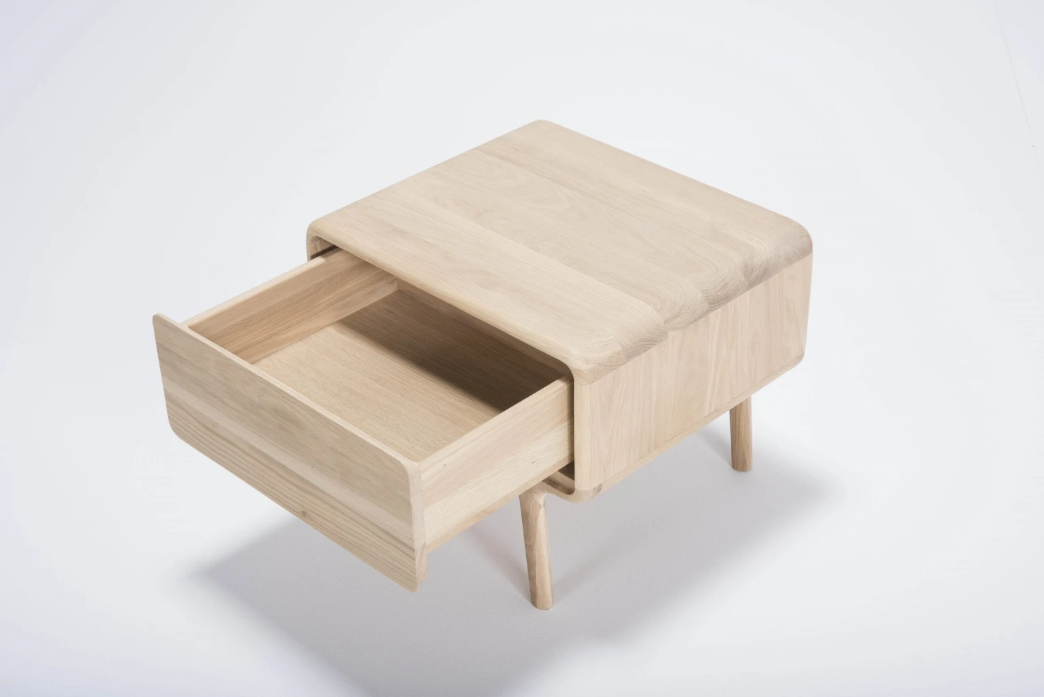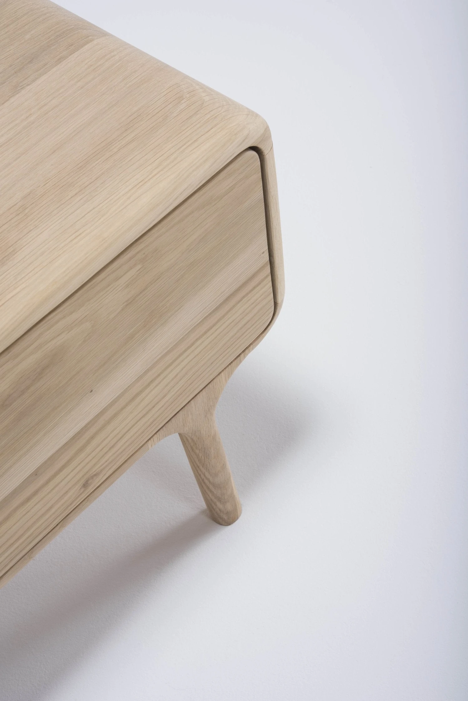 Passend zum leichtfüßigen Bett FAWN von Gazzda gibt es auch schöne Nachtkästchen. Massives Eichenholz und ein Design, das durch seine Schlichtheit besticht. Abgerundete Ecken, die ein Augenschmaus sind und auch haptisch Freude machen. Und die Schublade erfreut durch hervorragende Qualität.
