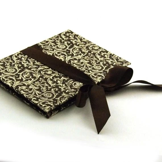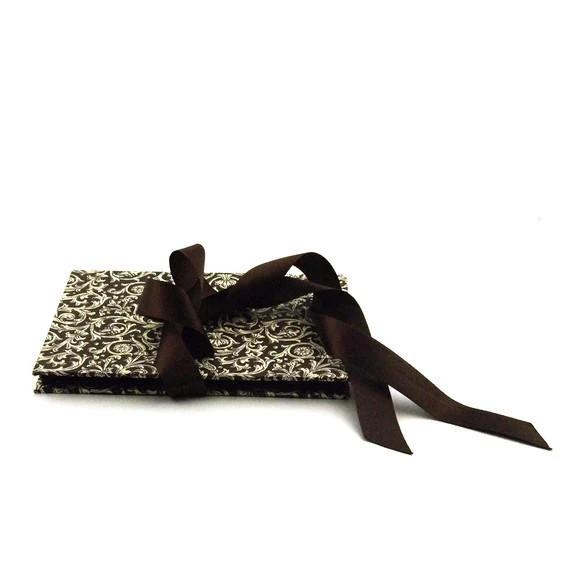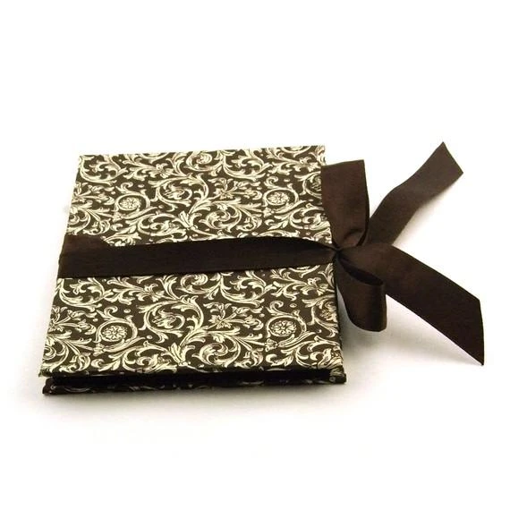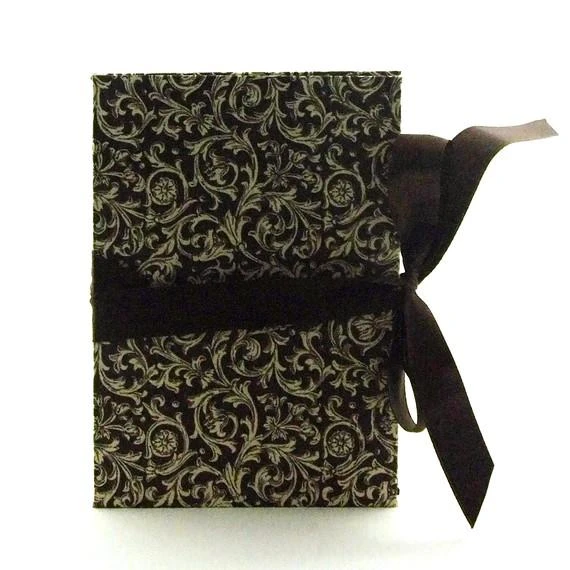 Leporello aus festem Buchbindekarton von Hand mit florentiner Papier bezogen. Es wird mit einem festen Satinband zusammengehalten.