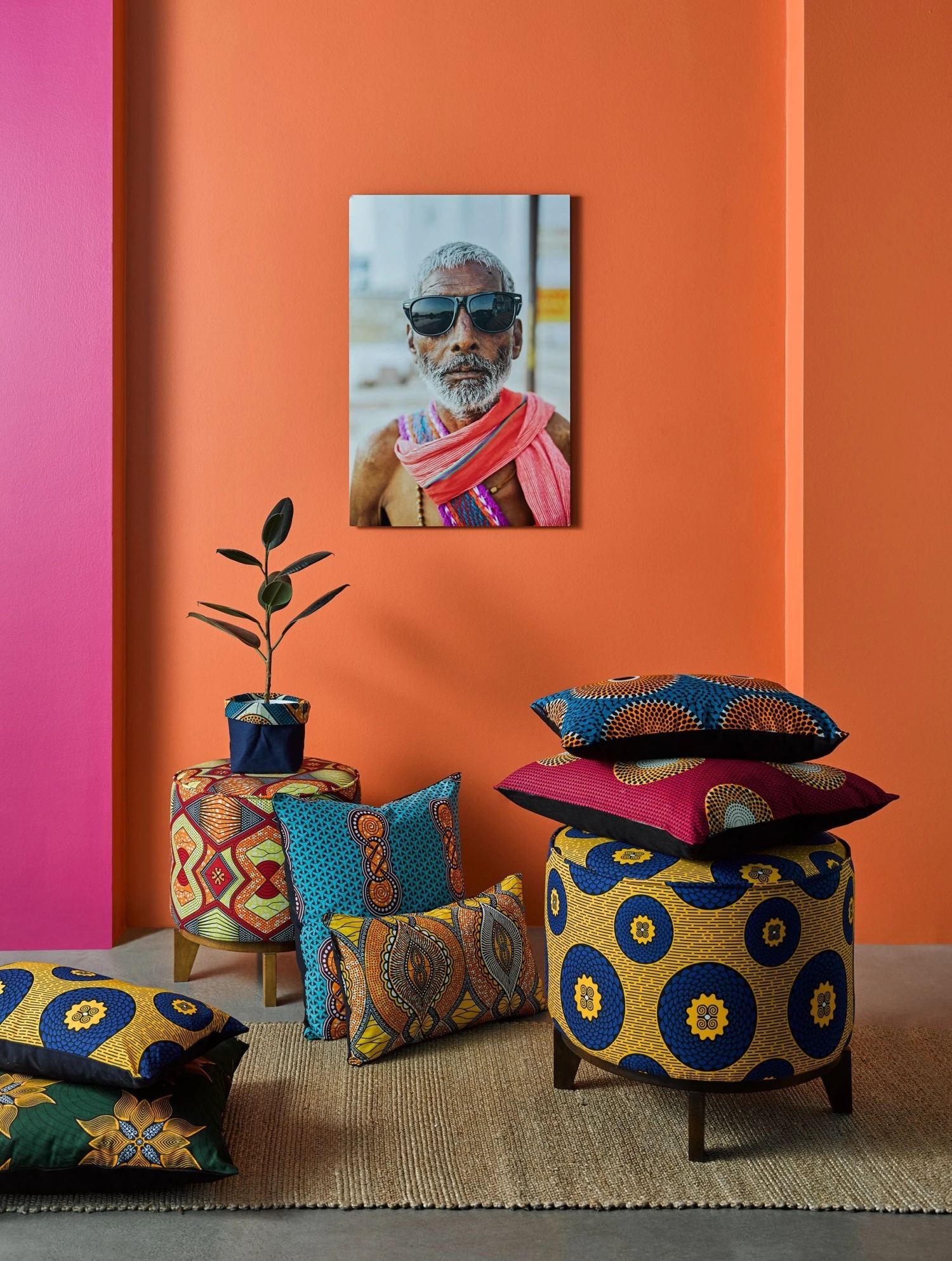 Sofakissen aus Baumwolle für alle deren Wohnung Farbe vertragen kann. „Pink und die Sonne“ ist ein Muster aus Afrikanischer Batik.