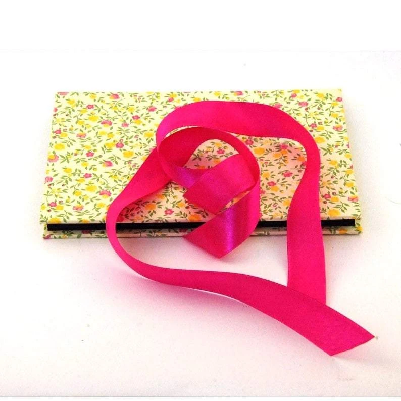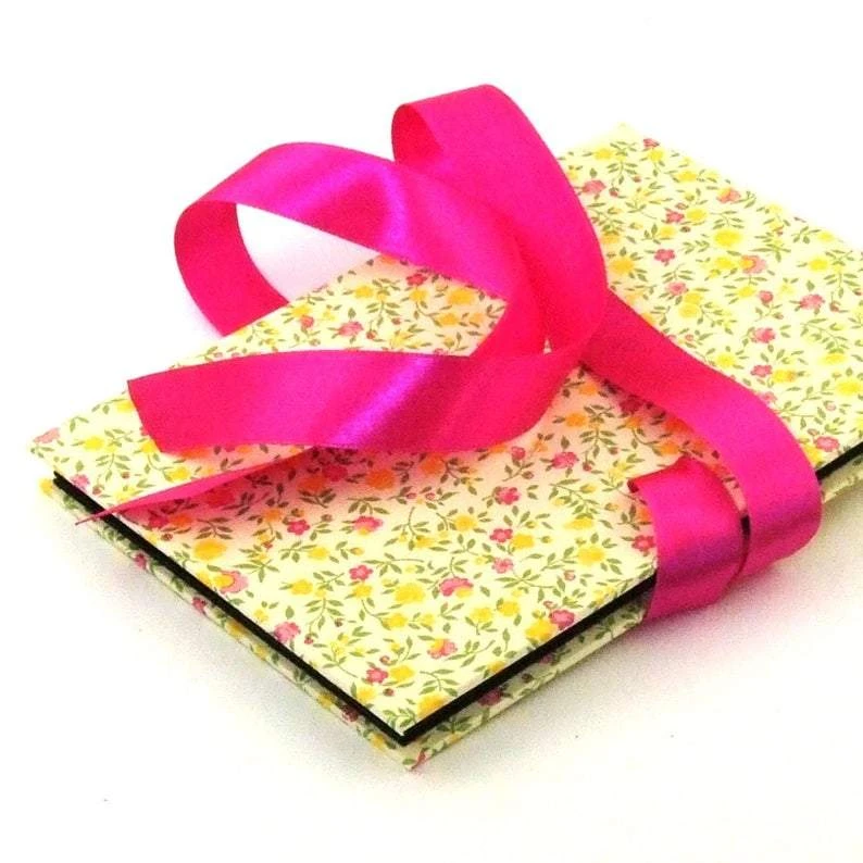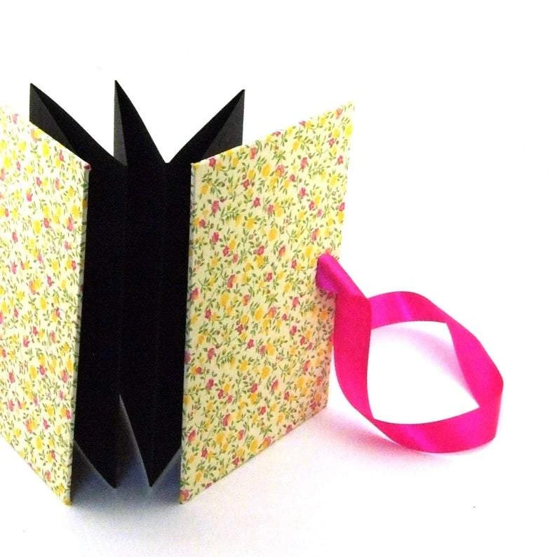 Leporello aus festem Buchbindekarton von Hand mit florentiner Papier bezogen. Es wird mit einem festen Satinband zusammengehalten.