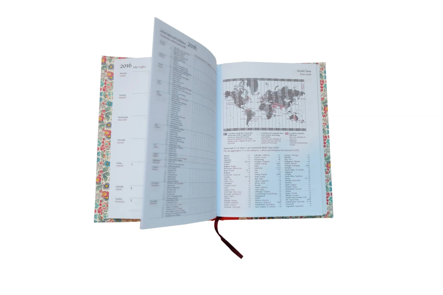 Der Welt-Kalender hat eine Größe von ca. 148 x 210mm (DinA 5) und verfügt neben Adress – Registratur über eine große Jahresübersicht und Monatsübersicht.
