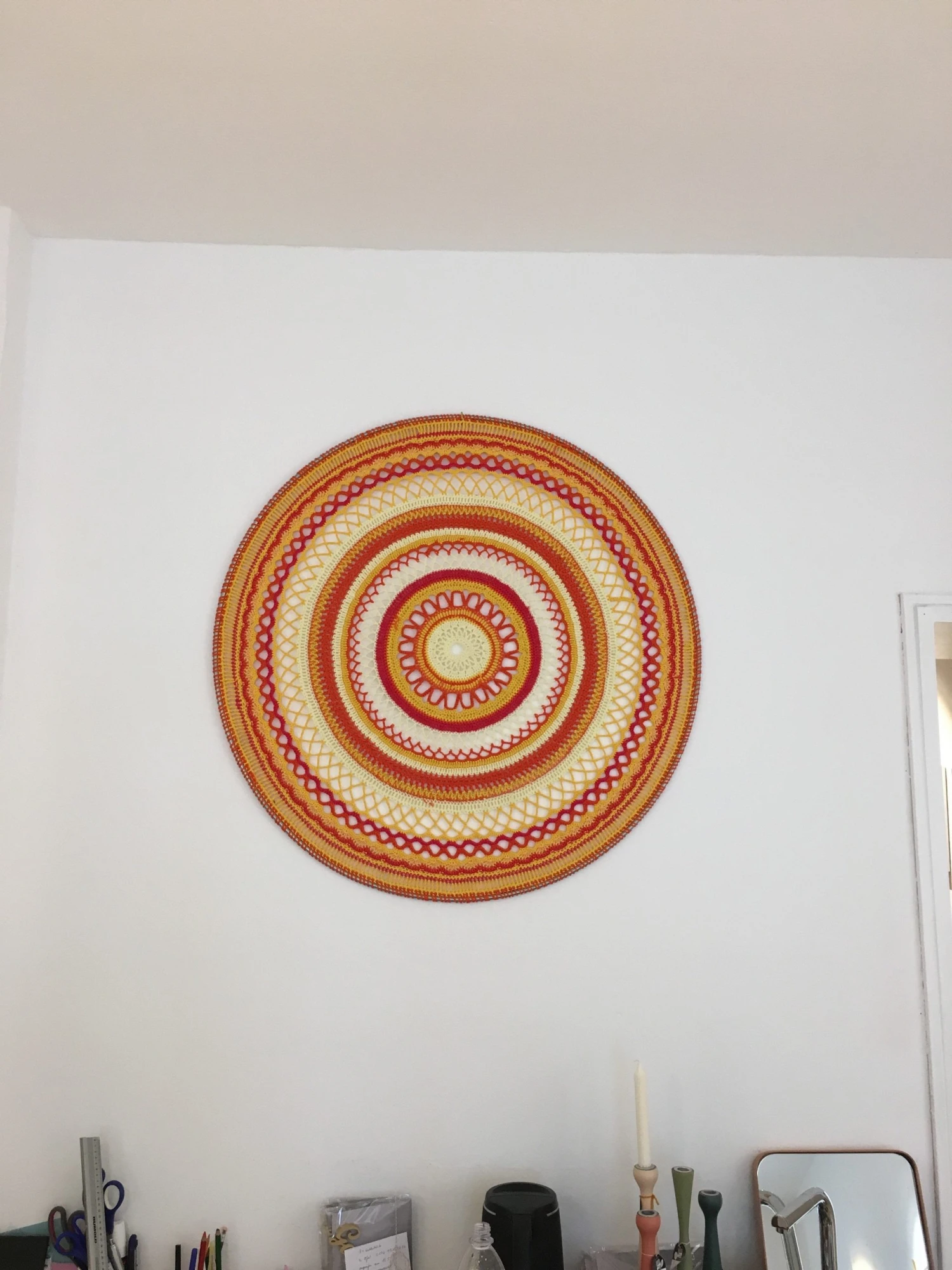 Fast 1 Quadratmeter Durchmesser. Gehäkelt in strahlenden orange und gelb- Tönen aus 100% Baumwolle, gespannt auf einen Stahlring.
