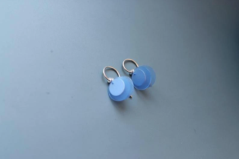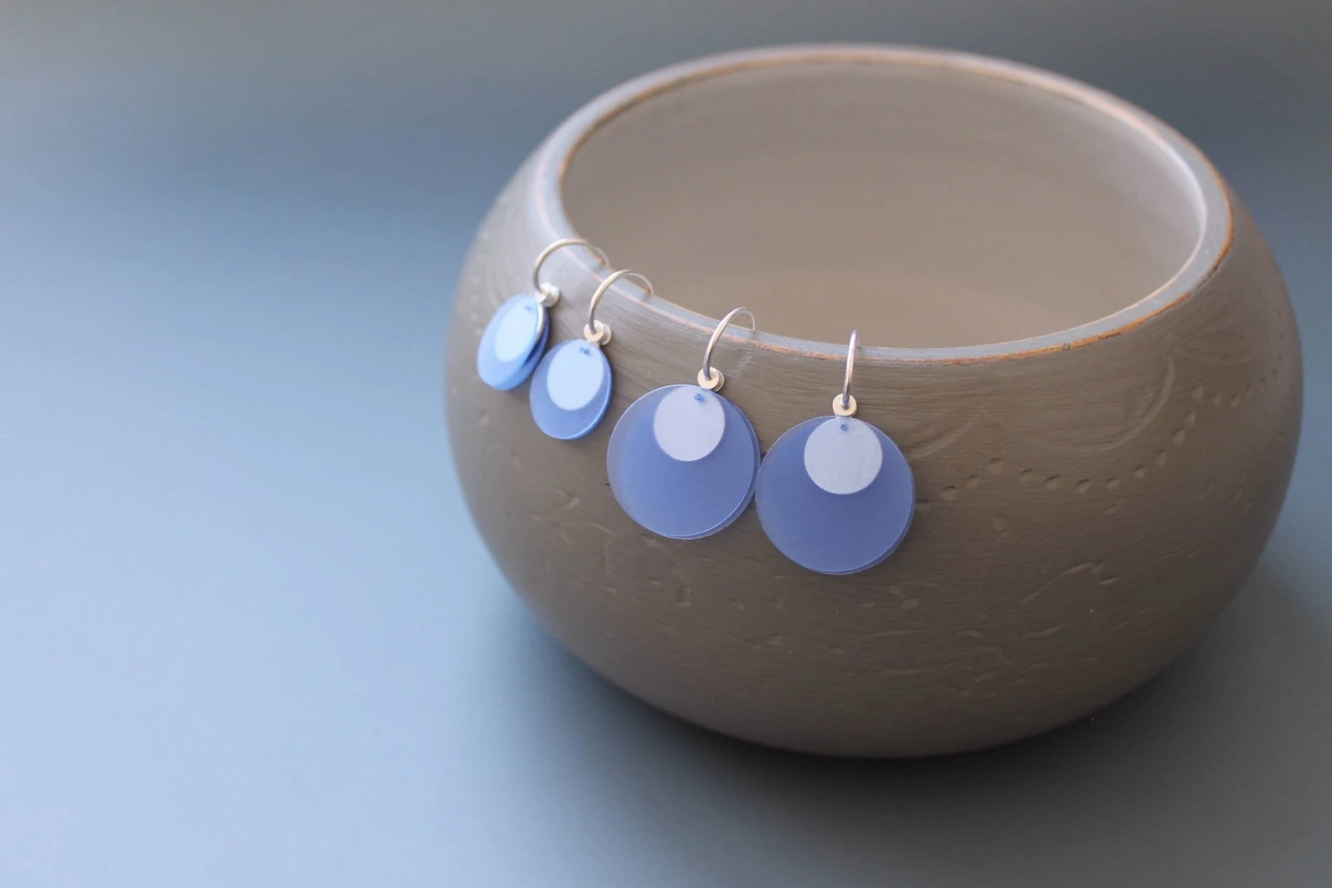 Er besteht aus zwei Kunststoffplättchen und einem Silberplättchen, die locker aufgehängt sind, und zeigt seine ganze Schönheit in der Bewegung am Ohr. Die Farben strahlen besonders im Gegenlicht.