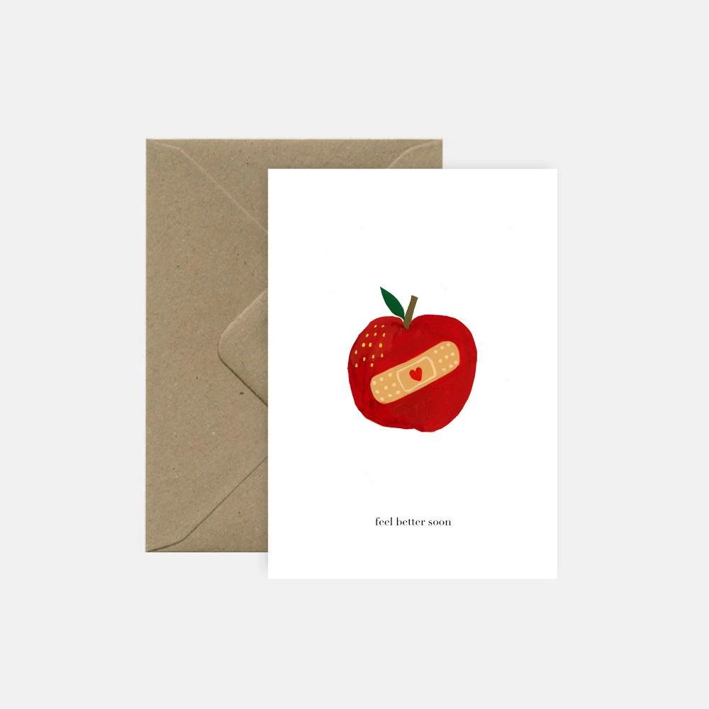 Wünsche baldige Genesung mit dieser Grußkarte, die einen roten Apfel zeigt, der mit einem Pflaster beklebt ist. Denn auch der beste Apfel schafft es nicht immer vor Krankheiten fern zu halten.