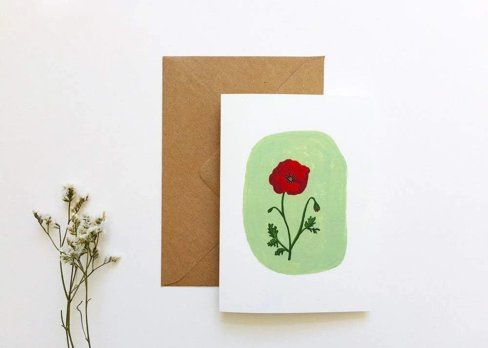 Eine süße Illustration der Künstlerin Martine Goevaerts mit einer Mohnblume auf grünem Hintergrund.