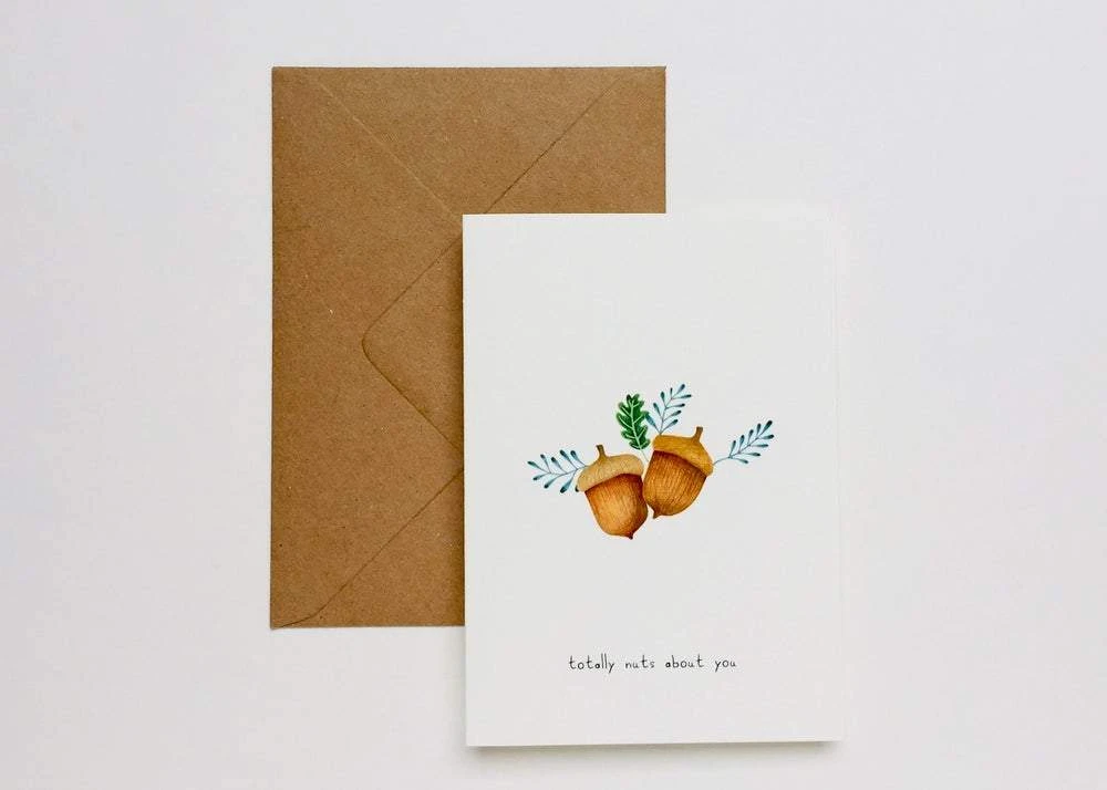 Mit dem Ausdruck „I’m nuts about you!“ – Ich bin verrückt nach Dir! Illustrierte Grußkarte mit Eicheln, die sich aneinander schmiegen für eine herbstliche Liebeserklärung.