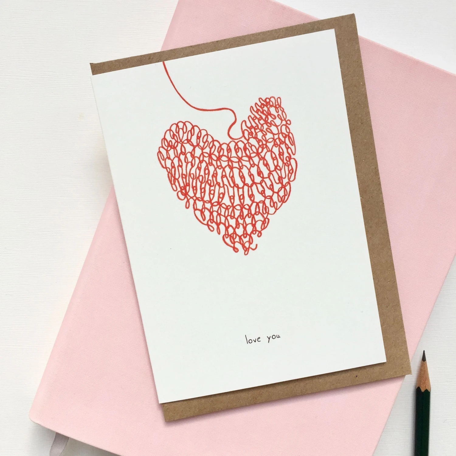 Eine gestrickte Liebeserklärung zeigt diese Karte. Rotes Herz aus Maschen.
