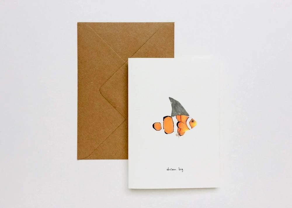 Große Träume soll man leben! Der kleine Clownfisch macht es erfolgreich vor und hat eine Haifischflosse! lllustrierte Grußkarte mit süßer Zeichnung.