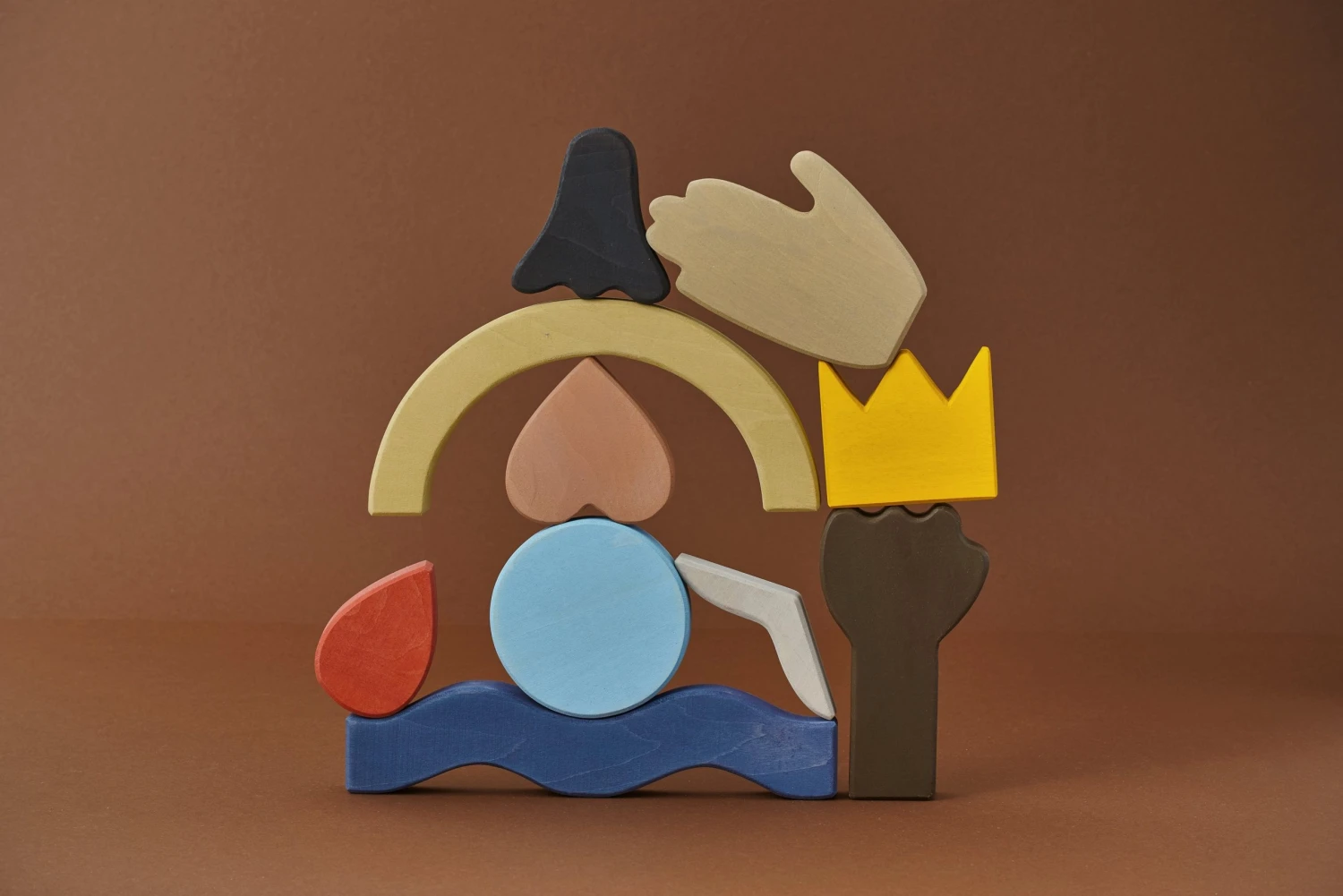 Ein Stapelspiel aus außergewöhnliches Holzformen mit Hand, Herz und Krone lassen sich wahre Kunstwerke als Balanceakt kombinieren.