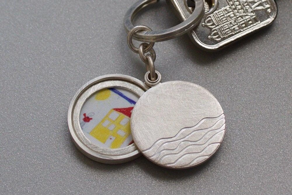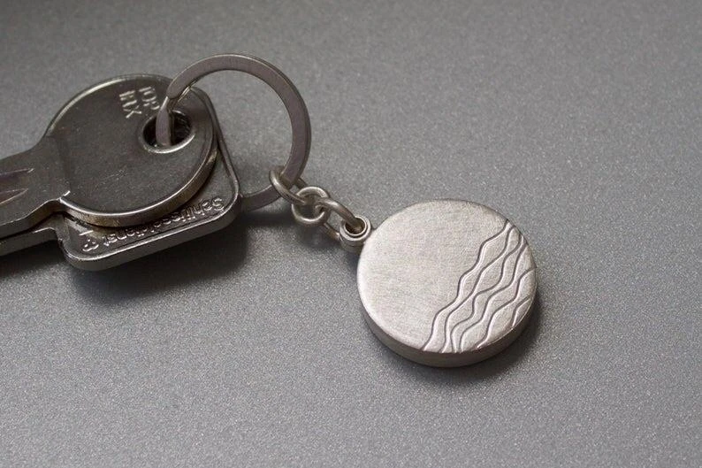 Ein silberner Schlüsselanhänger mit Medaillon und Wellen – Motiv.