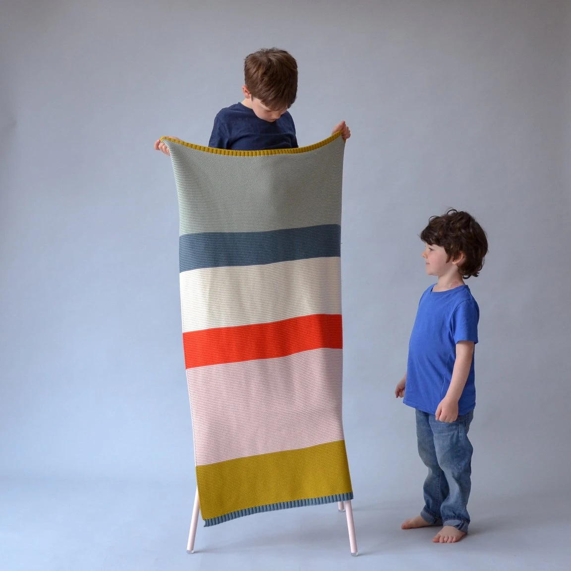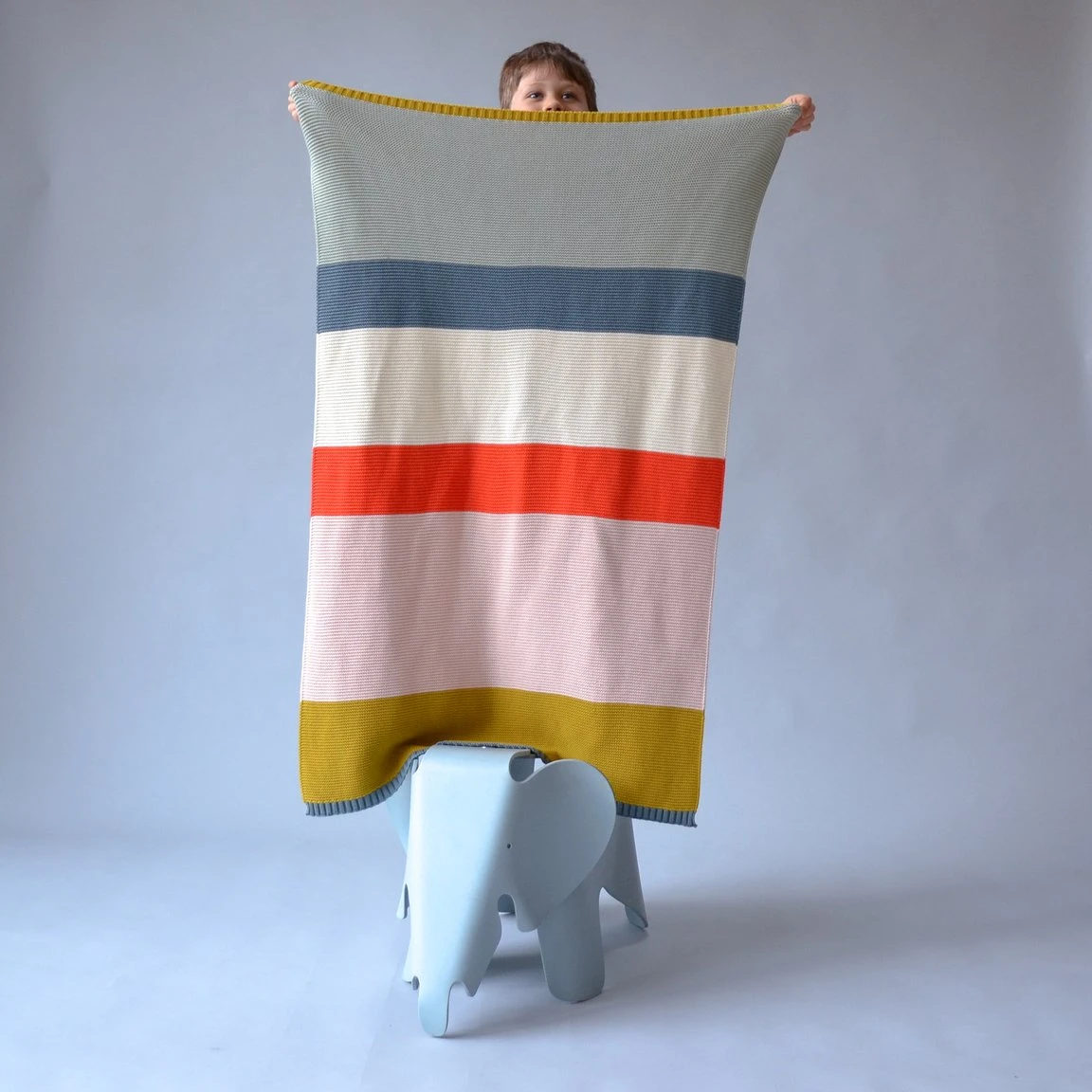 Fröhlich gestreifte, gestrickte Babydecke aus Baumwolle mit „krausen Maschen glatt rechts gestrickt“.