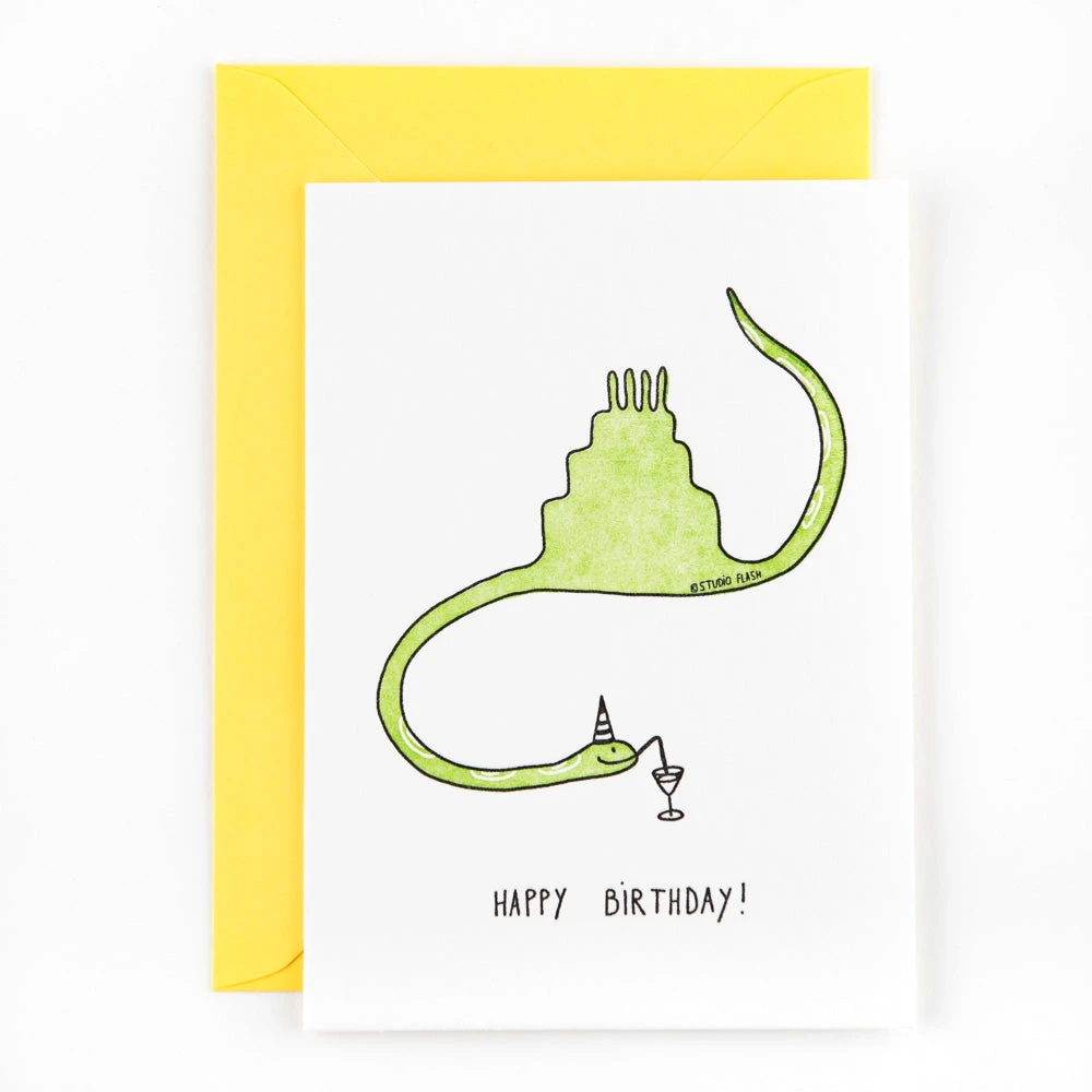 Die Schlange hat auf dem Weg die Geburtstagstorte verschluckt. Dafür feiert sie nun gerne mit Dir!