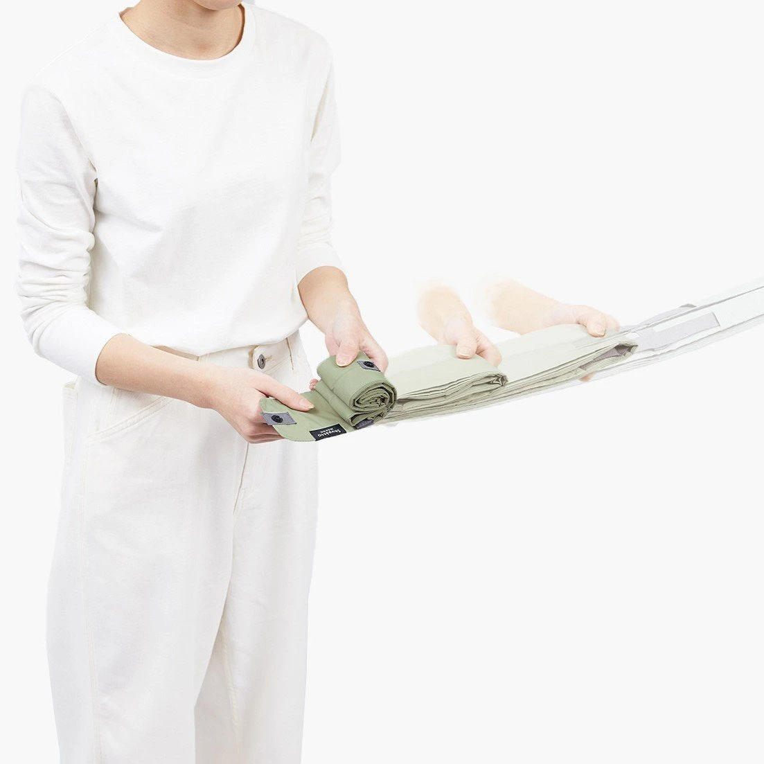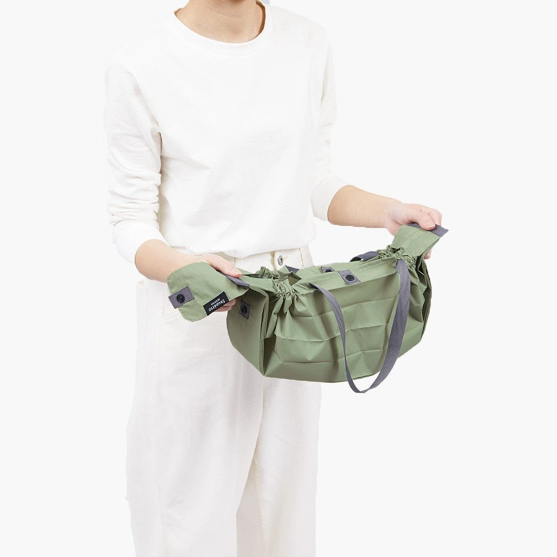 Eine grüne Falttasche der eleganten Art: Mit einem Ruck lässt sie sich nach der Nutzung wieder in Form bringen, rollen und verstauen. Eine praktische Einkaufstasche oder Sporttasche. Die sogar im Urlaub das Reisegepäck erweitert.