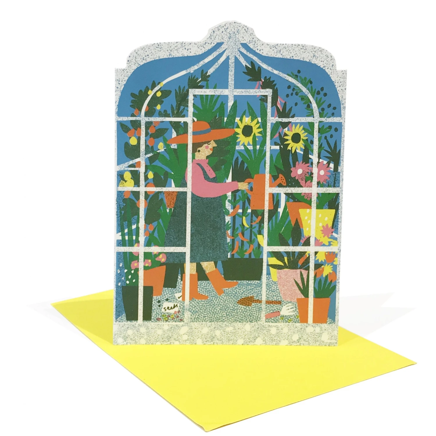 Ein ganzes Gewächshaus voller Sonnenblumen, Tulpen und anderen Blumen als Grußkarte – der besondere Blumengruß.