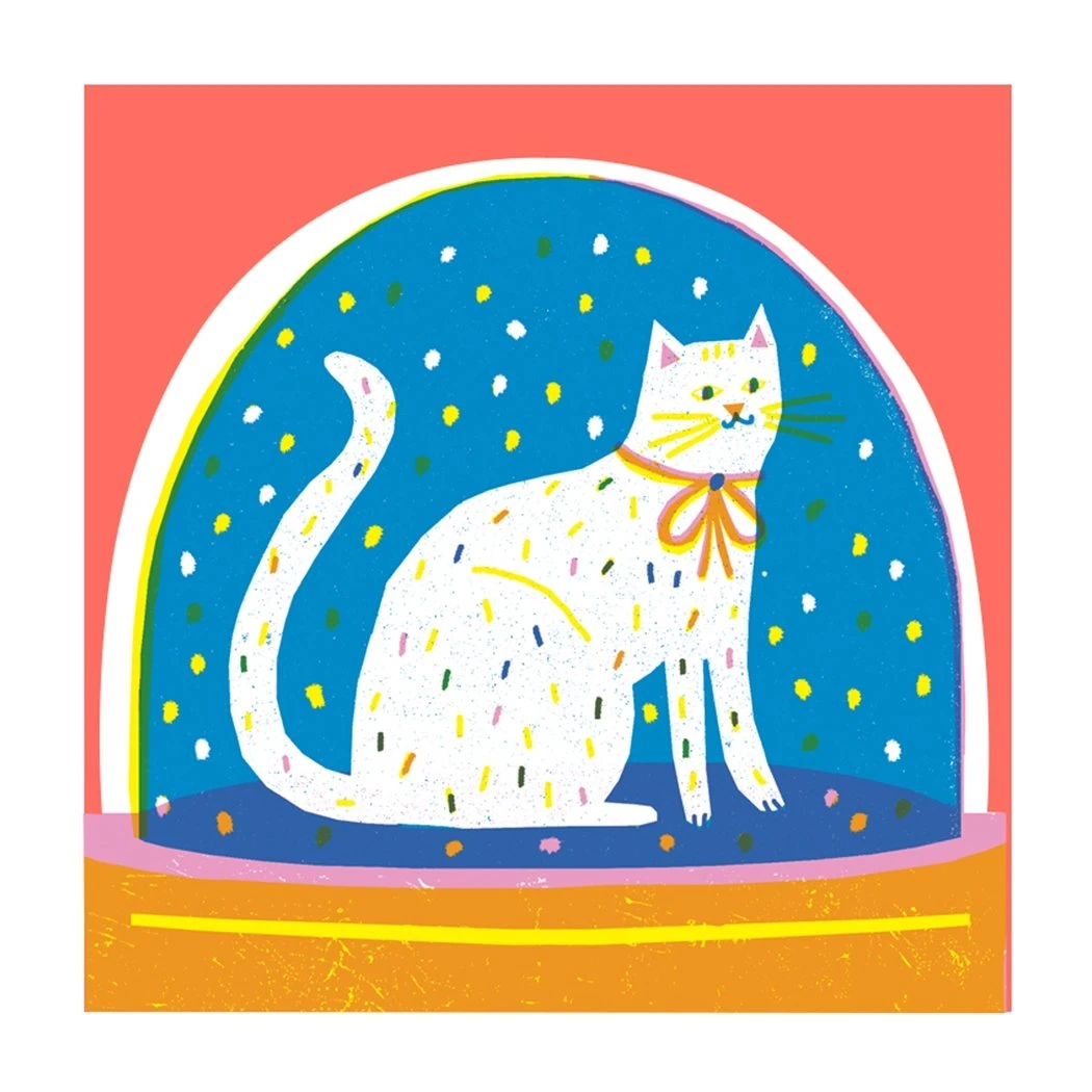 Die bunte Karte ist eine in der Form der Schneekugel ausgeschnittene Grußkarte, die sich für Weihnachts- und Wintergrüße eignet. Sie kommt mit einem Neonroten passenden Briefumschlag.