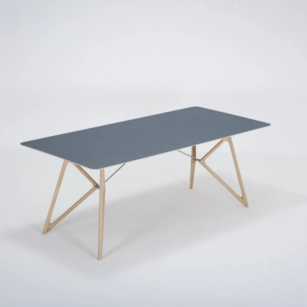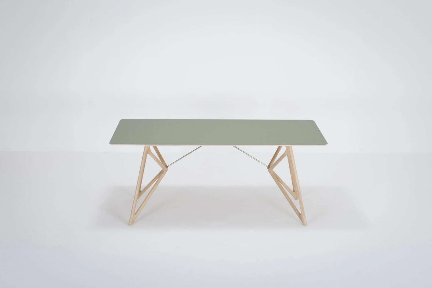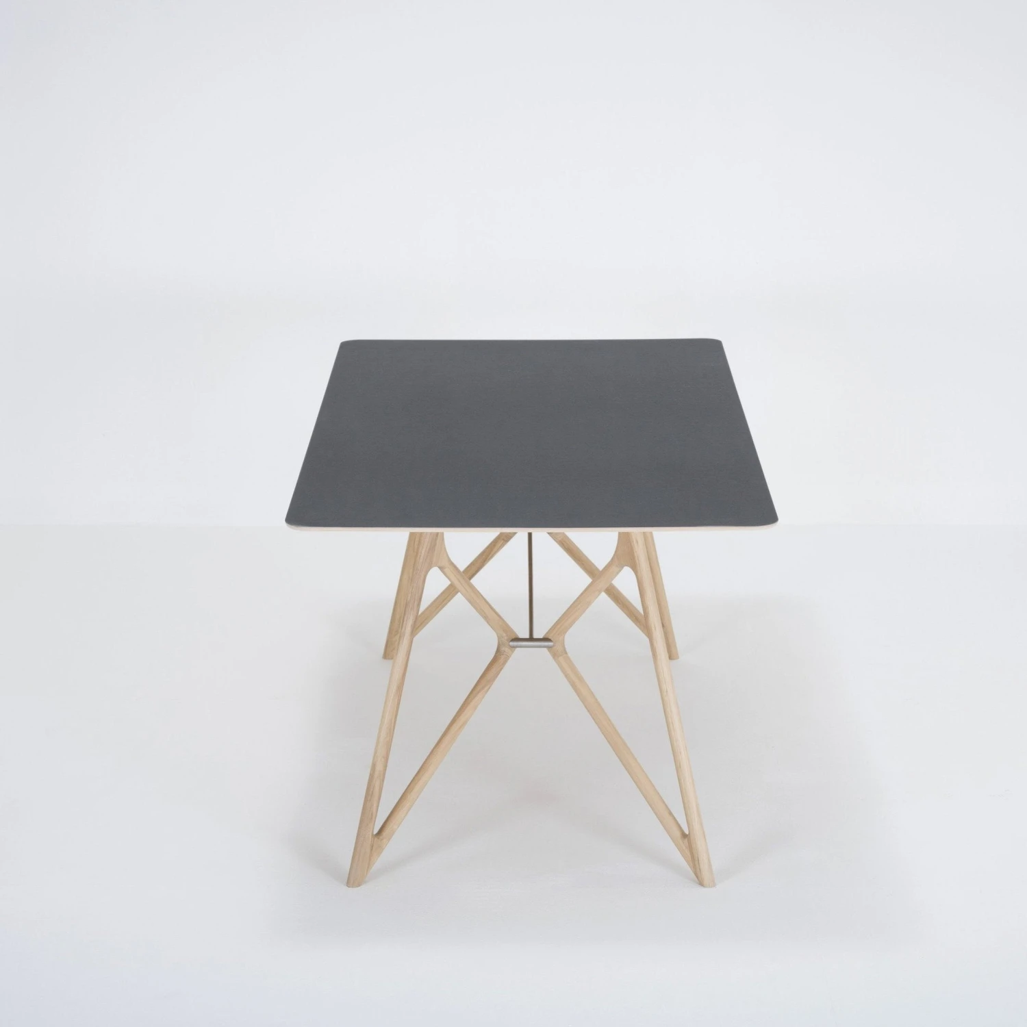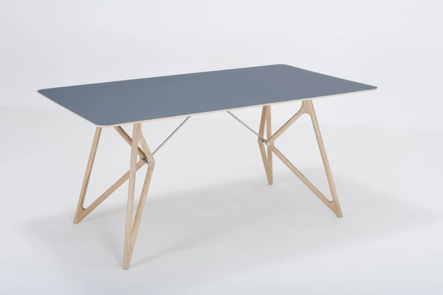 Der Tisch TINK von Gazzda besticht durch die besondere Form der Beine, die schon fast einer künstlerischen Skulptur ähneln. Sie geben dem Eichentisch mit praktischer und wunderschöner Linoleumplatte einen fast schwebenden Charakter.