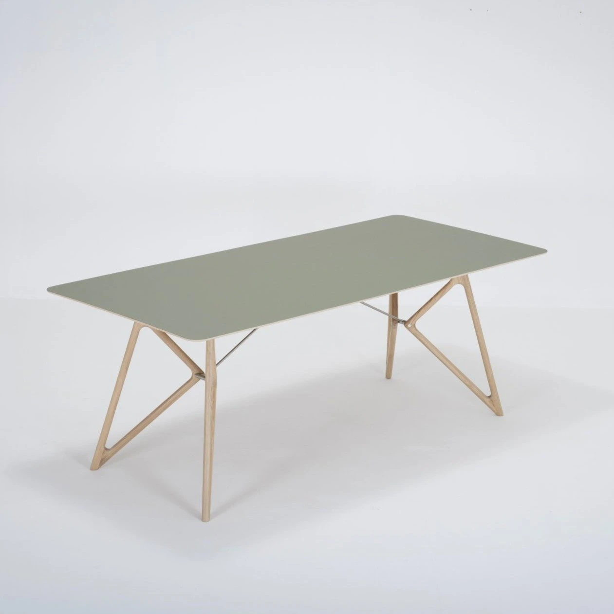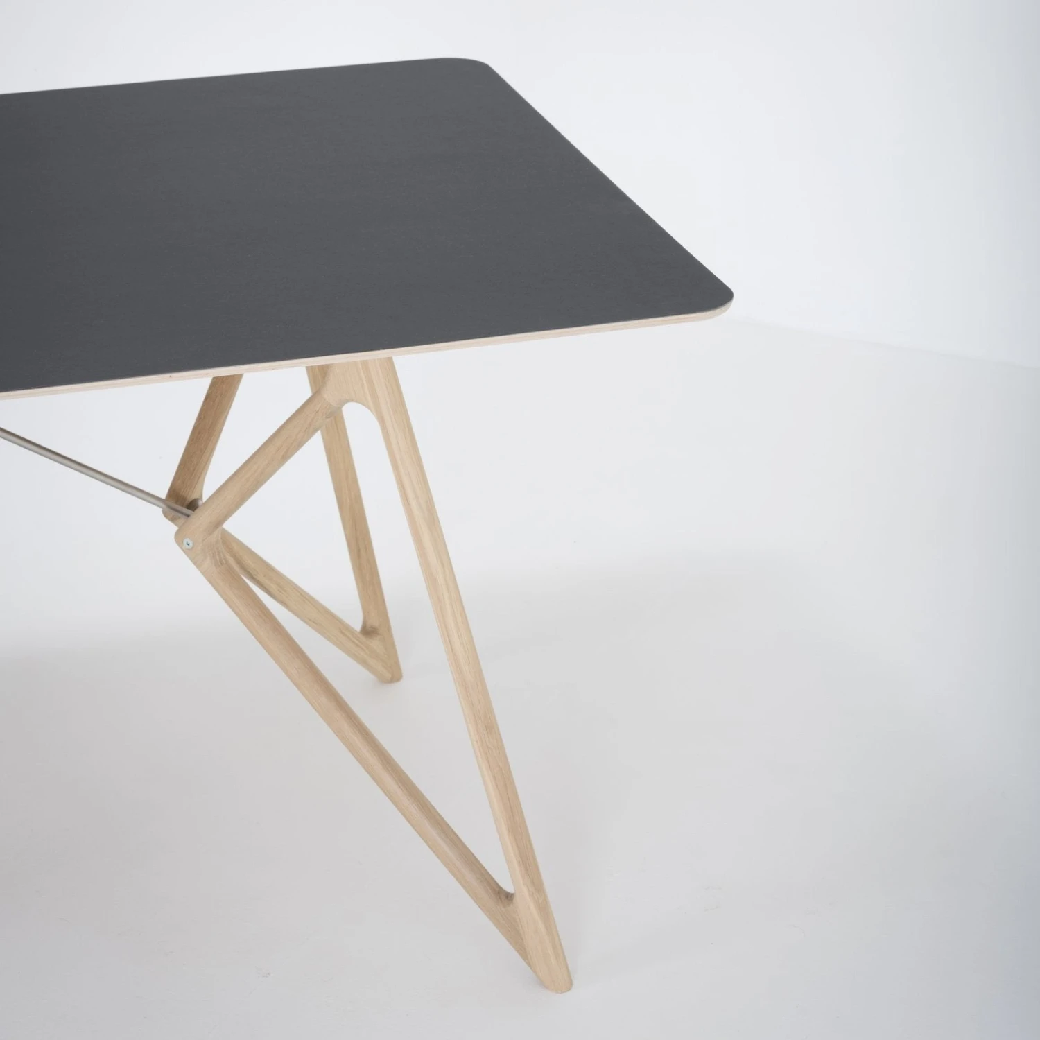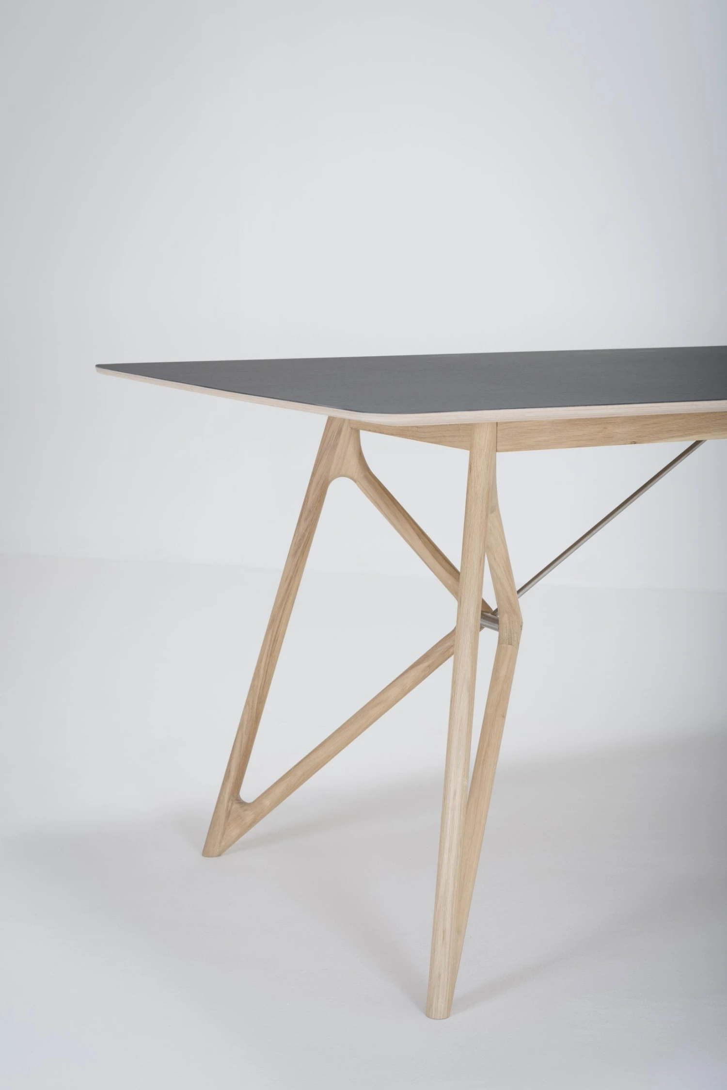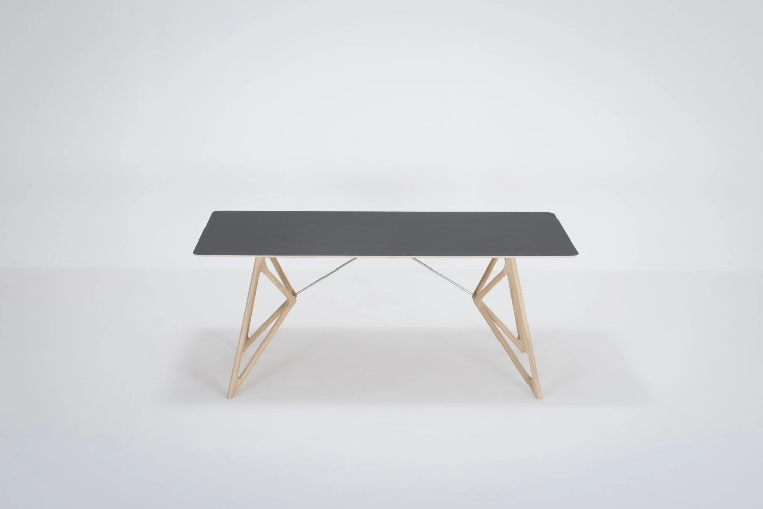 Der Tisch TINK von Gazzda besticht durch die besondere Form der Beine, die schon fast einer künstlerischen Skulptur ähneln. Sie geben dem Eichentisch mit praktischer und wunderschöner Linoleumplatte einen fast schwebenden Charakter.